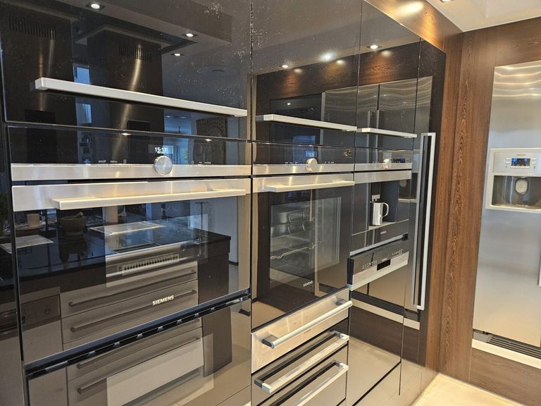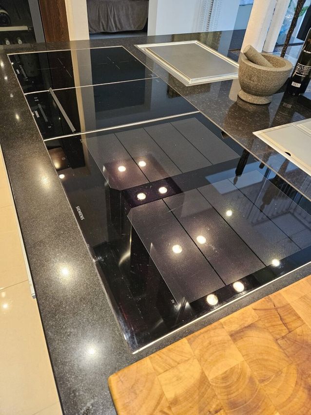 Hochwertige Siemens-Geräte – darunter ein Backofen mit Wärmeschublade, Dampfgarer, Mikrowelle, integrierte Kaffeemaschine, zwei Geschirrspüler sowie ein doppelseitiger Kühlschrank mit Eiswürfelbereiter und ein separater Weinkühler – garantieren höchsten Komfort.