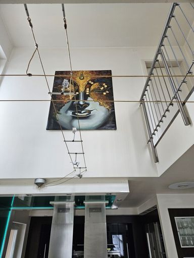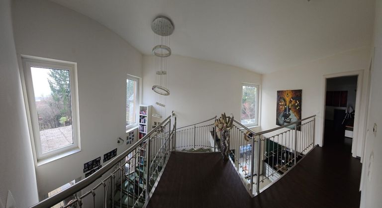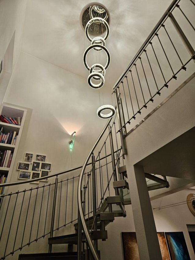 Der außergewöhnlich gestaltete Stiegenaufgang ins Obergeschoß mit offener Galerie bildet ein weiteres Highlight. Eine imposante, rund drei Meter lange italienische Designerleuchte setzt hier einen eindrucksvollen Akzent - die Treppe präsentiert sich in moderner Ausführung aus hochwertigem Edelstahl und stilvollen Glasstufen.