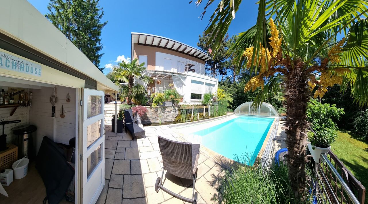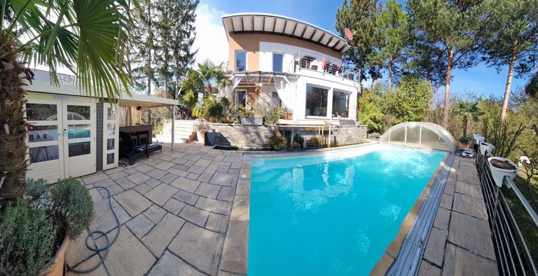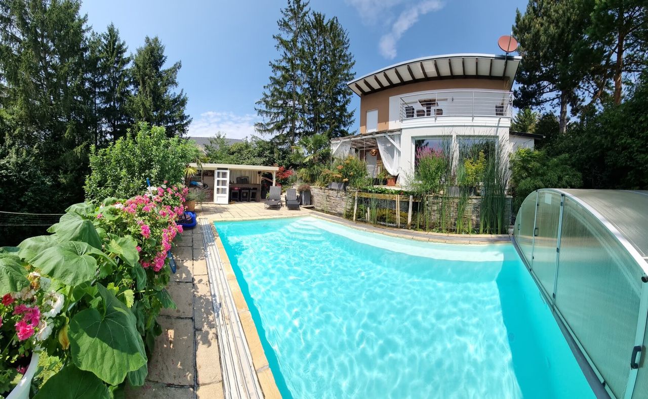 Ein besonderes Highlight stellt das gegenüber dem Pool situierte Gartenhaus dar, das eine vollständig eingerichtete Cocktailbar bereithält. Das ca. 7 x 4 m große, beheizbare Schwimmbecken mit eleganter Glasüberdachung lädt ganzjährig zum entspannten Badevergnügen ein.