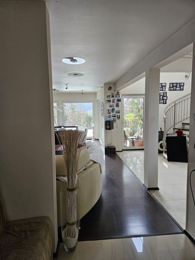 Der anschließende Wohnbereich beeindruckt durch seine großzügige, offene Architektur und herrlichem Grünblick. Bodentiefe Fenster unterstreichen den atriumähnlichen Charakter und schaffen eine einladende, lichtdurchflutete Atmosphäre. Ein drehbarer Kamin bildet das stilvolle Herzstück des Raumes und ist flexibel zum Lounge- oder Essbereich hin ausrichtbar, wodurch er in beiden Zonen für behagliche Wärme und besondere Wohnqualität sorgt.