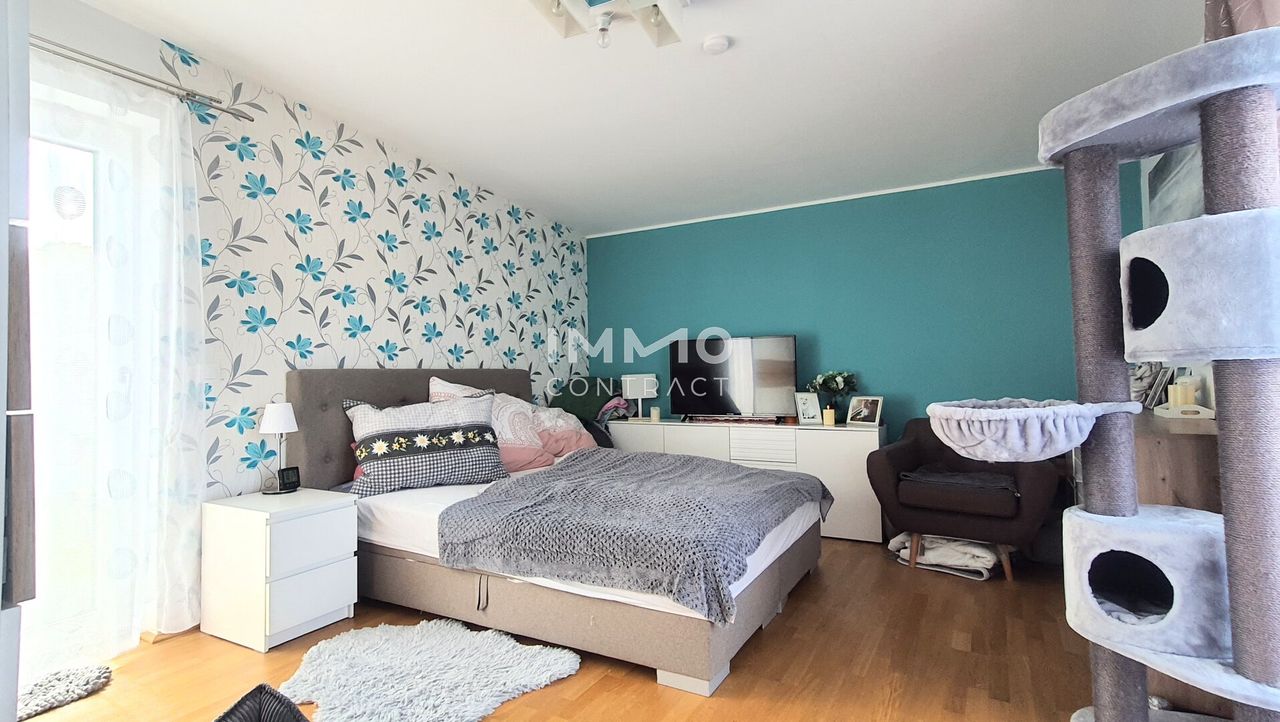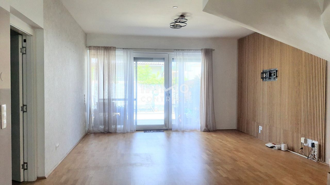 Über eine schöne geschwungene Holztreppe gelangt man ins Obergeschoß, das eine selbständige Wohneinheit bildet. Das gemütliche Wohnzimmer mit integrierter Wohnküche führt in zwei Schlafzimmer. Auf dieser Ebene befindet sich ebenfalls ein Tageslicht-Bad. Auf die große Dachterrasse gelangt man sowohl vom Wohnzimmer als auch den beiden Schlafzimmern. Von hier genießt man den schönen Blick auf den Wienerwald.