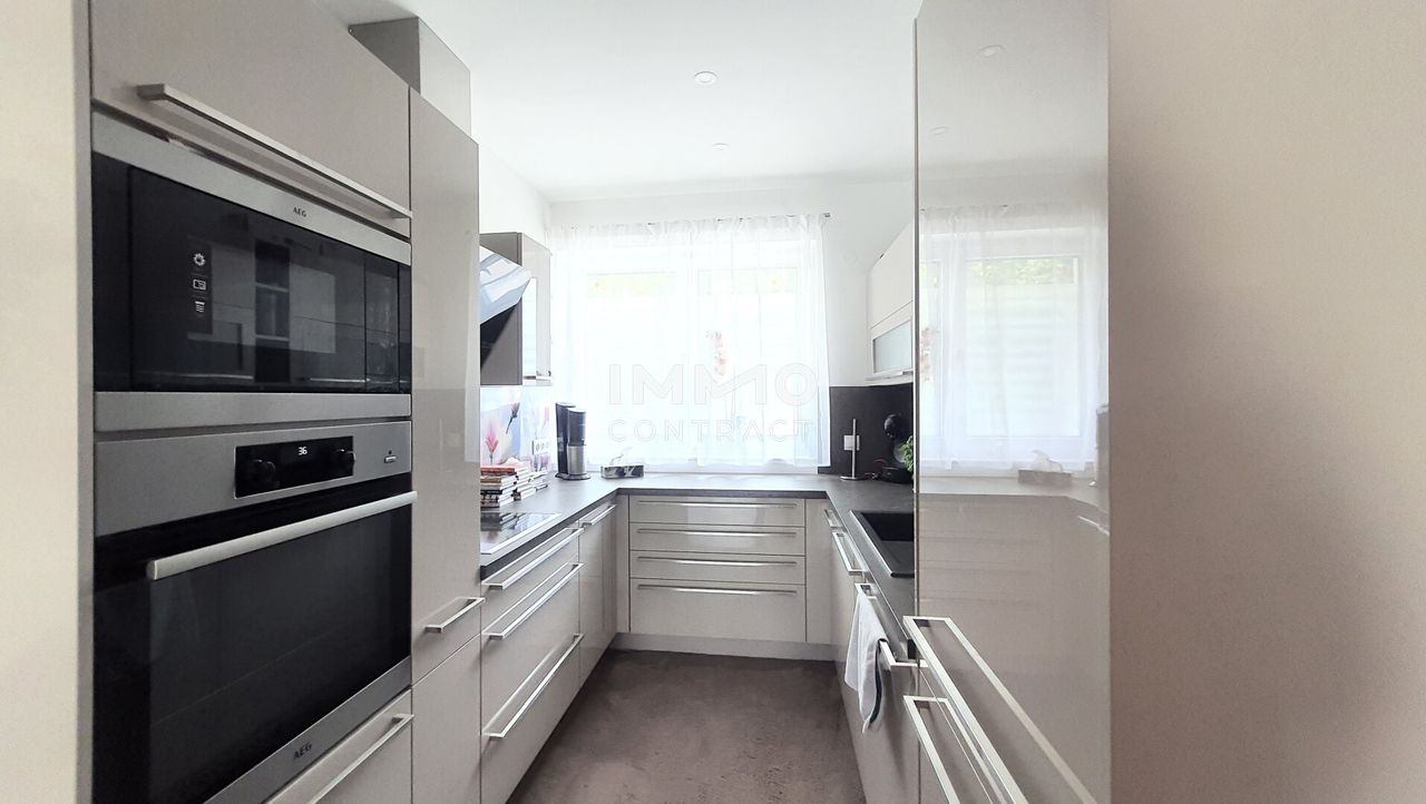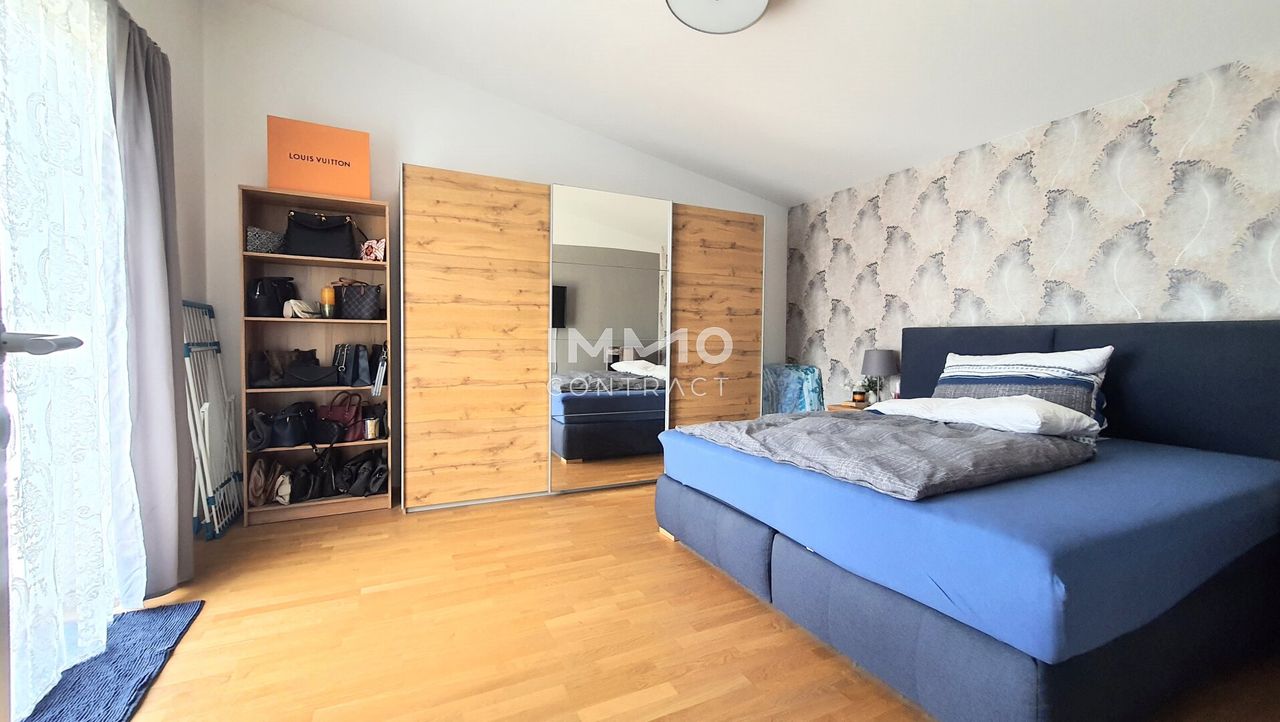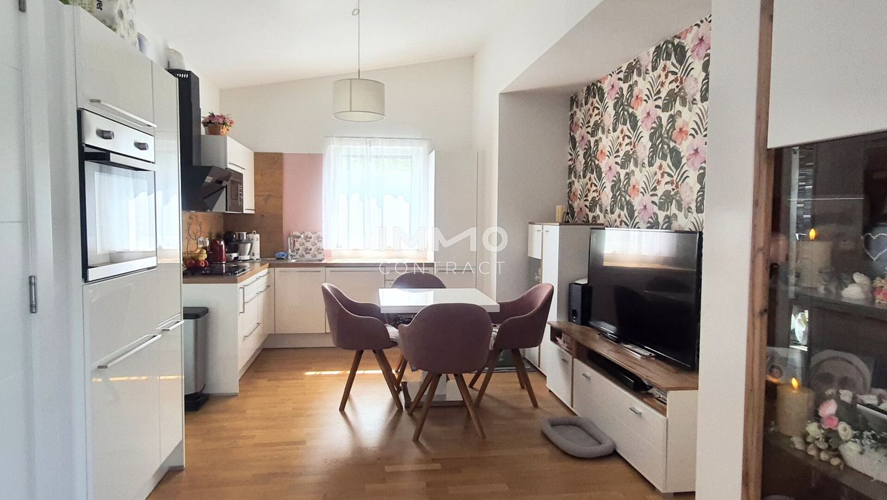 Im hinteren Bereich des Wohnzimmers liegt die hochwertige Einbauküche. Über einen kleinen Gang gelangt man zu den zwei Schlafzimmern, dem Tageslicht-Bad und dem separaten WC. Ein Abstellraum und der ebenerdig gelegene Lagerraum bieten viel Stauraum.