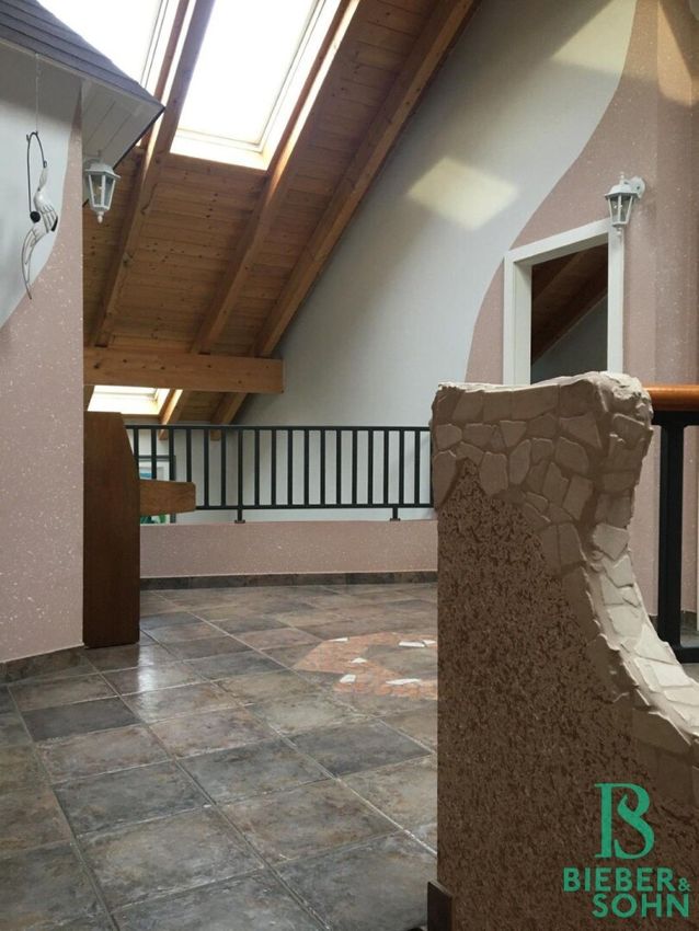 Ein robuster Stiegenaufgang im Vorraum führt in die ca. 16m² große Galerie im Dachgeschoss. Von hier aus sind 3 Zimmer, in den Größen von 12m² bis 15m², ein großes Badezimmer mit Wanne, ein separates WC und der Balkon ins Wohnzimmer zu erblicken.