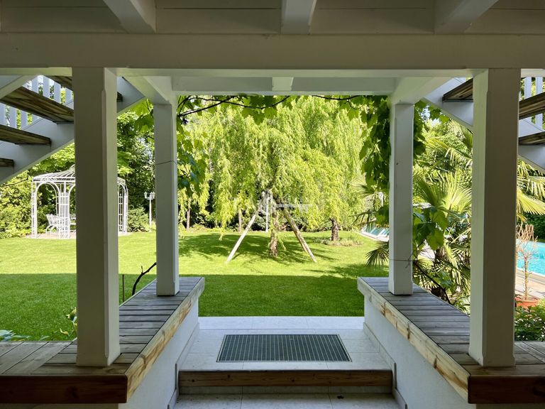 Das idyllische große Grundstück mit altem Baumbestand und Pool sind ein weiteres Highlight dieses einzigartigen Anwesens - der gepflegte Garten ist eine Oase der Ruhe und Schönheit.