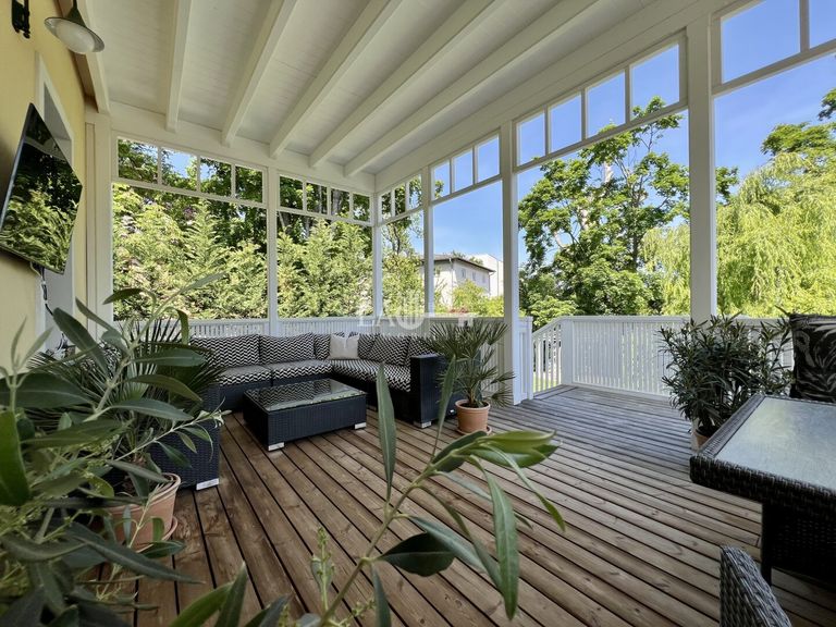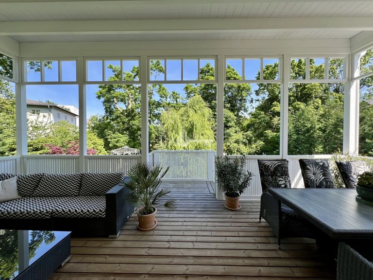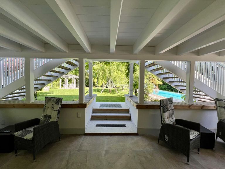 Eine südlich ausgerichtete Holzveranda mit großzügigen Abgang in den Garten lädt zum Verweilen ein - ein kleines Paradies, das keine Wünsche offen lässt.