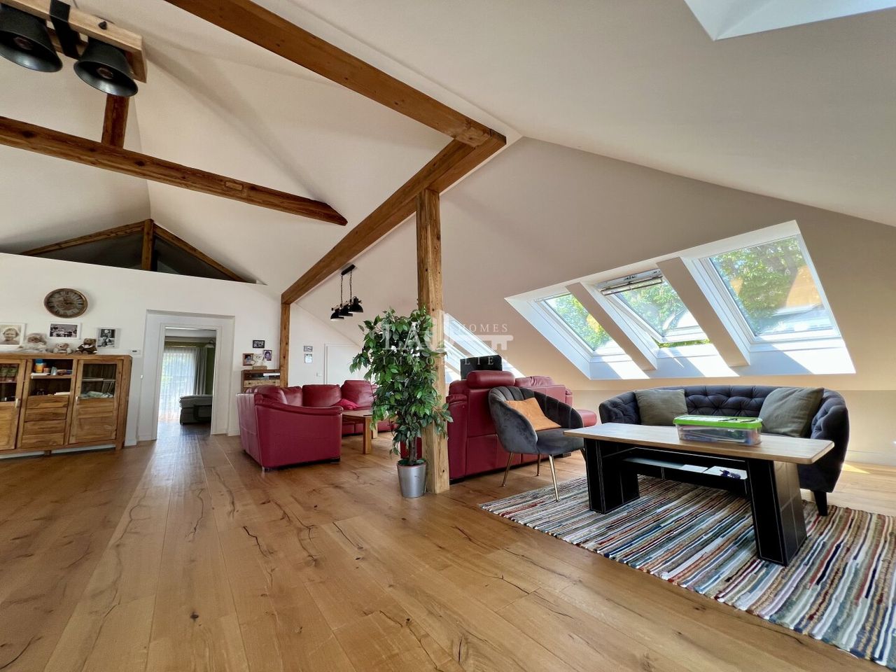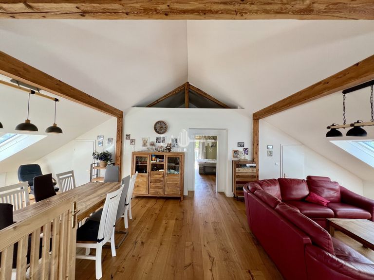 Licht, Luft und Freiheit - der loftartige Wohnbereich im Obergeschoss beeindruckt mit freien Deckenbalken und Fensterfronten, die für eine helle, einladende Atmosphäre sorgen.