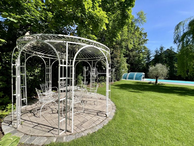 Die Beleuchtung im Außenbereich setzt stilvolle Akzente - welche die Gartenlandschaft imposant in Szene setzt. Ein Mähroboter sorgt für einen immer perfekt gemähten Rasen.