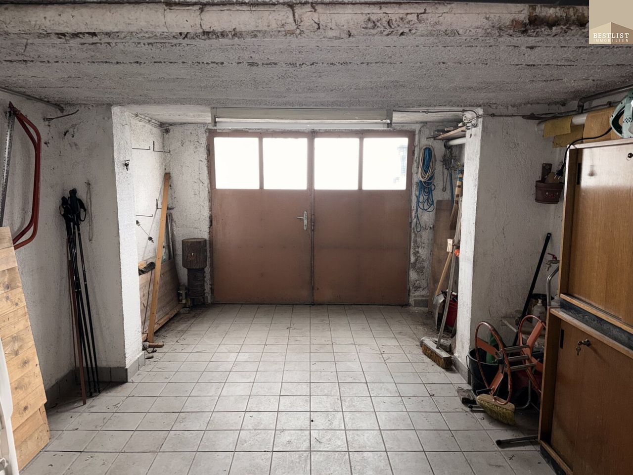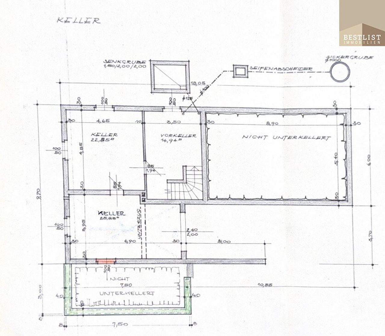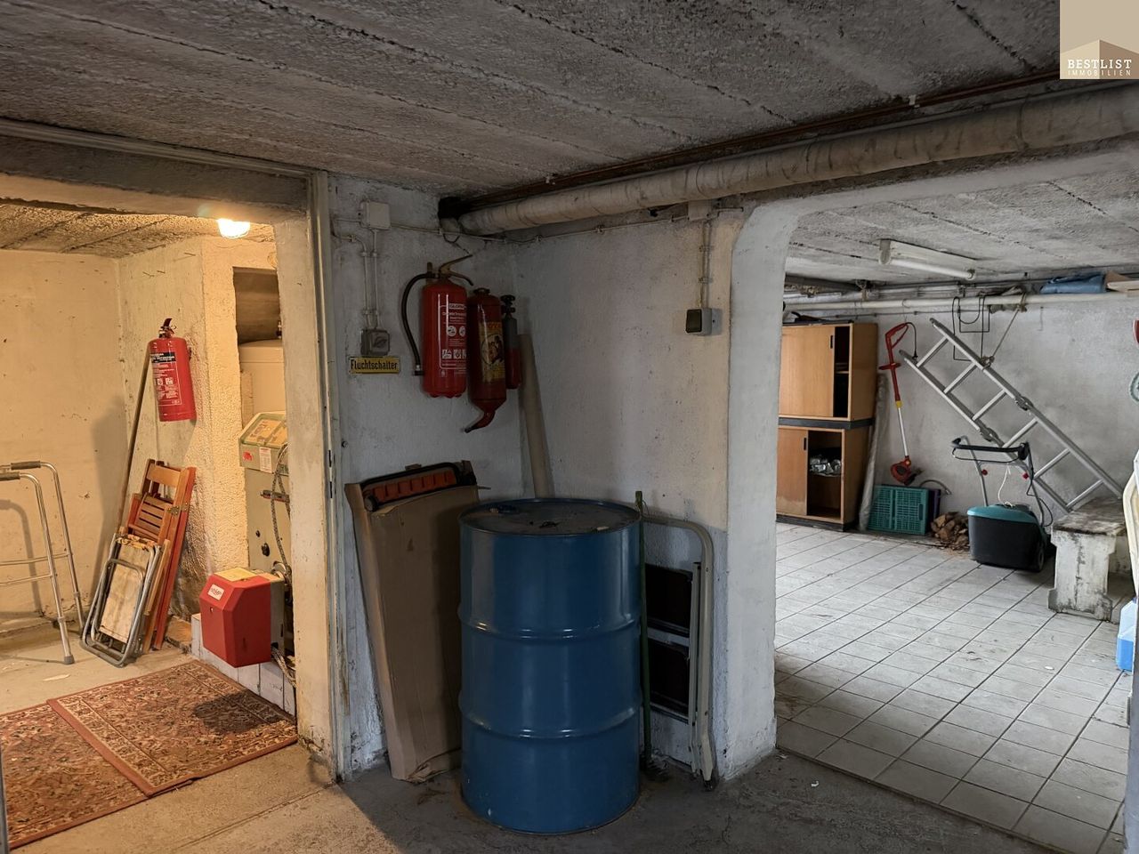 Das Haus wurde als Hochparterre errichtet, wodurch sich darunter ein Souterrain-Keller mit praktischer Garagenzufahrt und großzügigen Nebenräumen befindet – ideal für Handwerker, Gartengeräte oder als Werkstattbereich. Das Objekt wird mittels Ölheizung beheizt. Der Öltank mit einem Fassungsvermögen von 4.000 Litern ist derzeit etwa zur Hälfte befüllt.