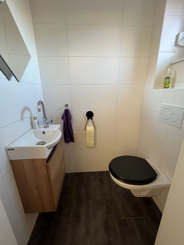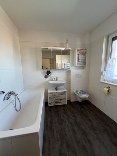 Ausgestattet mit Toilette, Dusche und Badewanne erfüllt es sowohl den Wunsch nach schneller Erfrischung als auch nach entspannenden Wellness-Momenten. Verflieste Wände sorgen für eine hochwertige, pflegeleichte Optik, während das Fenster den Raum mit viel natürlichem Licht durchflutet und ein angenehmes Raumklima schafft. Ein moderner Handtuchheizkörper garantiert jederzeit warme, griffbereite Handtücher. Zusätzlich steht ein praktischer Waschmaschinenanschluss zur Verfügung.