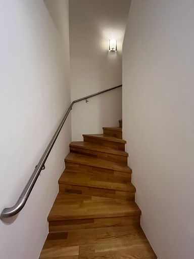 - ein Vorzimmer mit ausreichend Platz für eine Garderobe samt Schrank und Zugang zum Obergeschoß über eine hochwertige Holztreppe mit Edelstahlhandlauf sowie eine Gäste-Toilette mit Handwaschbecken und Fenster.