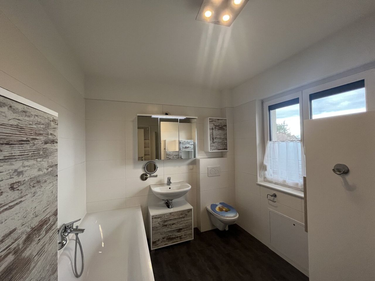 Ausgestattet mit Toilette, Dusche und Badewanne erfüllt es sowohl den Wunsch nach schneller Erfrischung als auch nach entspannenden Wellness-Momenten. Verflieste Wände sorgen für eine hochwertige, pflegeleichte Optik, während das Fenster den Raum mit viel natürlichem Licht durchflutet und ein angenehmes Raumklima schafft. Ein moderner Handtuchheizkörper garantiert jederzeit warme, griffbereite Handtücher. Zusätzlich steht ein praktischer Waschmaschinenanschluss zur Verfügung.