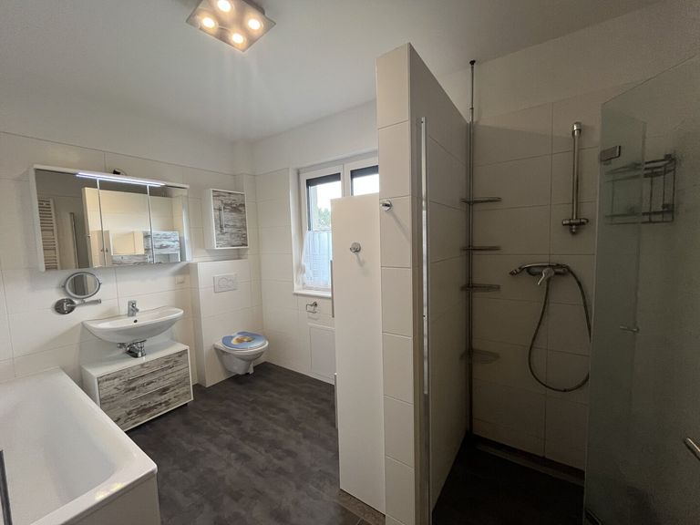 Ausgestattet mit Toilette, Dusche und Badewanne erfüllt es sowohl den Wunsch nach schneller Erfrischung als auch nach entspannenden Wellness-Momenten. Verflieste Wände sorgen für eine hochwertige, pflegeleichte Optik, während das Fenster den Raum mit viel natürlichem Licht durchflutet und ein angenehmes Raumklima schafft. Ein moderner Handtuchheizkörper garantiert jederzeit warme, griffbereite Handtücher. Zusätzlich steht ein praktischer Waschmaschinenanschluss zur Verfügung.