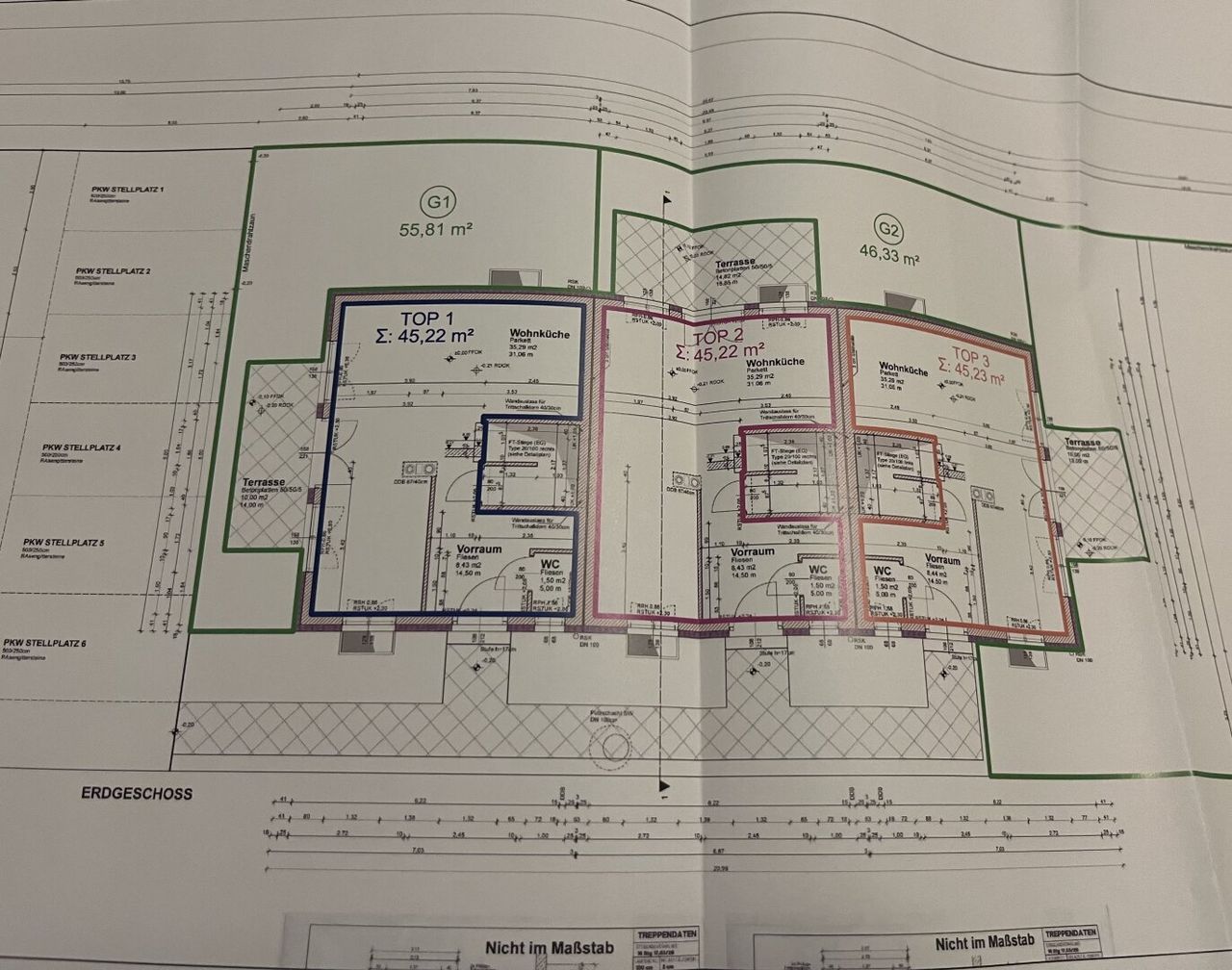 Zwei, im Eigentum befindliche Kfz-Stellplätze bieten komfortablen Raum für Fahrzeuge direkt auf dem Vorplatz und ermöglichen dank der weiten Wendefläche ein entspanntes Ein- und Ausparken. Besonders im Alltag zeigt sich der Vorteil: Einkäufe, Gepäck oder schwere Taschen lassen sich mühelos direkt bis zur Haustür bringen – praktischer geht es kaum.