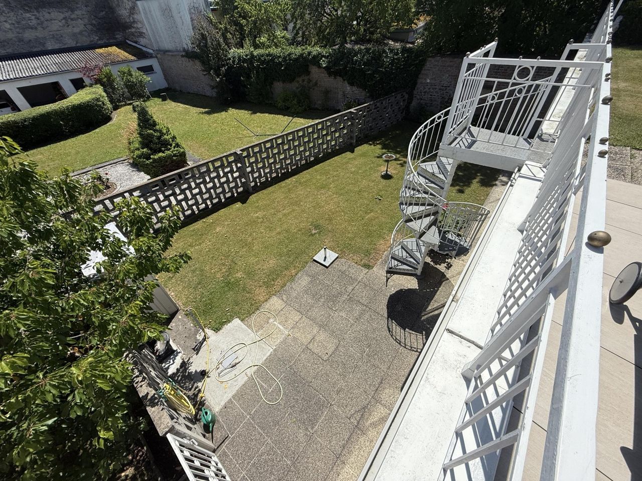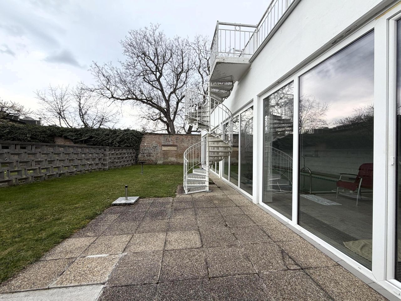 - das Wohnzimmer mit Ausgang auf der vorgelagerten Dachgartenterrasse in den angeschlossenen Dachgarten. Vom Dachgarten führt eine Wendeltreppe aus Metall runter in den Erdgeschossgarten, vor der Verglasung des Indoor-Pools.