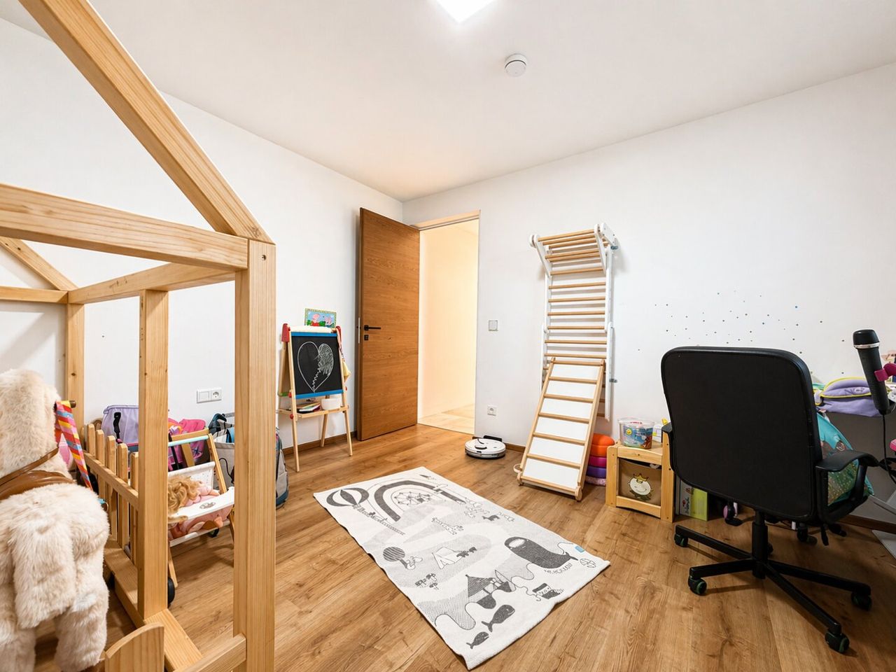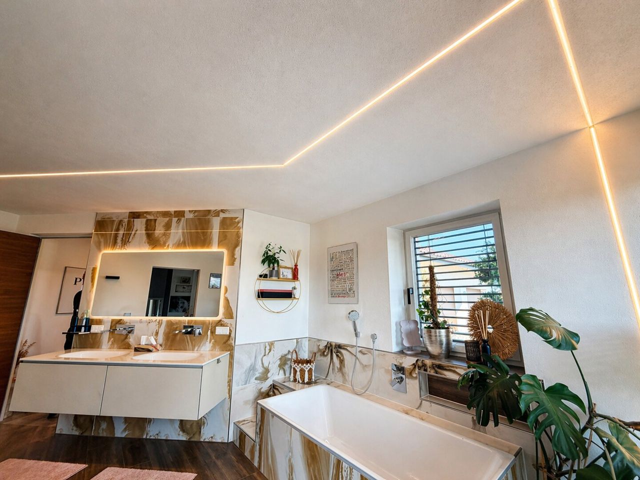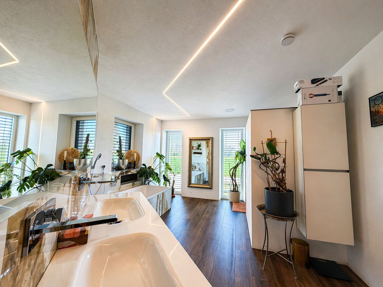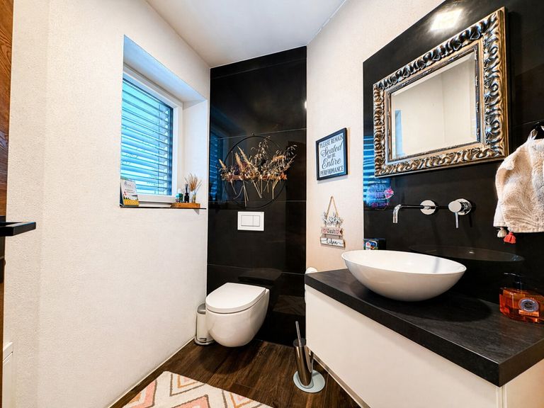 Zwei elegante Badezimmer sorgen für maximalen Komfort im Alltag und bieten sowohl Raum für die morgendliche Routine als auch für entspannte Abendmomente. Die kombinierte Fußbodenheizung und -kühlung garantiert ganzjährig ein angenehmes Raumklima – im Winter wohlig warm, im Sommer erfrischend kühl.