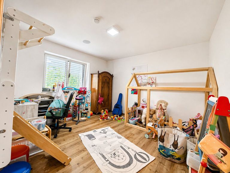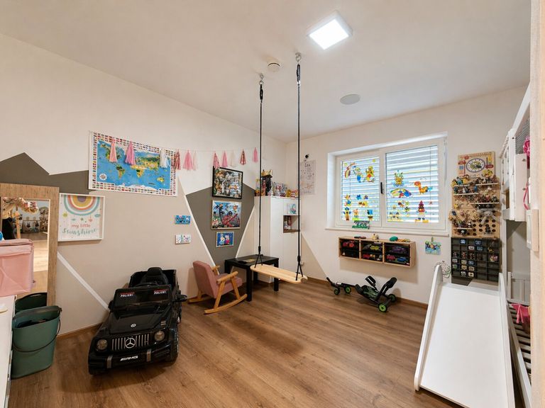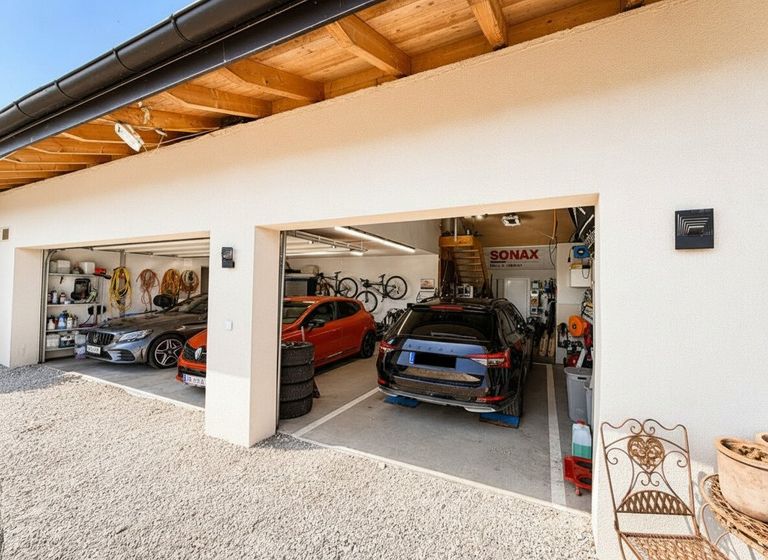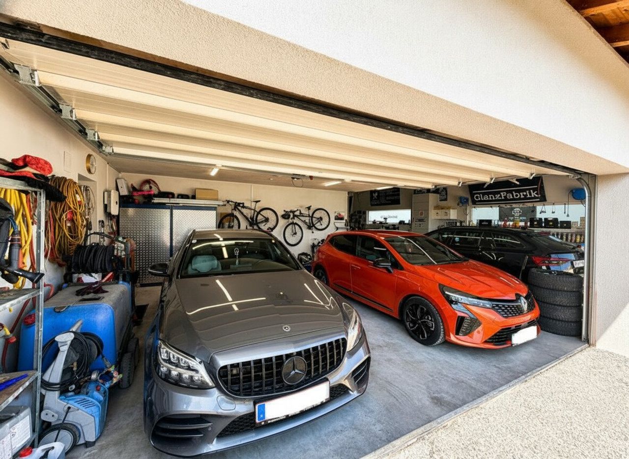 Die großzügige Garage bietet Platz für bis zu drei Autos und überzeugt zusätzlich mit praktischem Stauraum – ideal für Familien und Autoliebhaber.