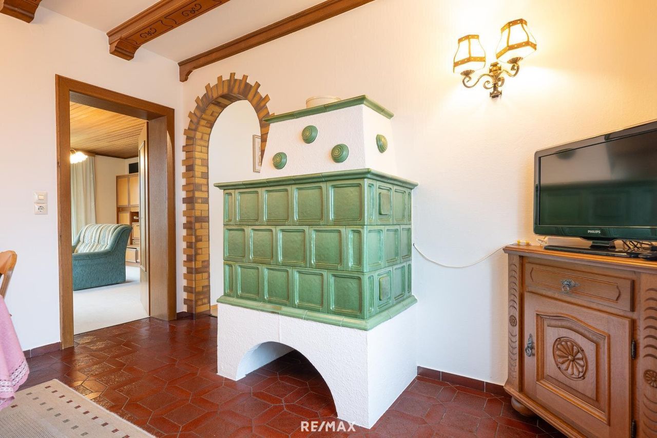 • Erdgeschoss: zentraler Eingangsbereich, Küche, Esszimmer mit Kachelofen, Wohnzimmer mit Terrassenzugang, 2 Schlafzimmer, Bad & WC