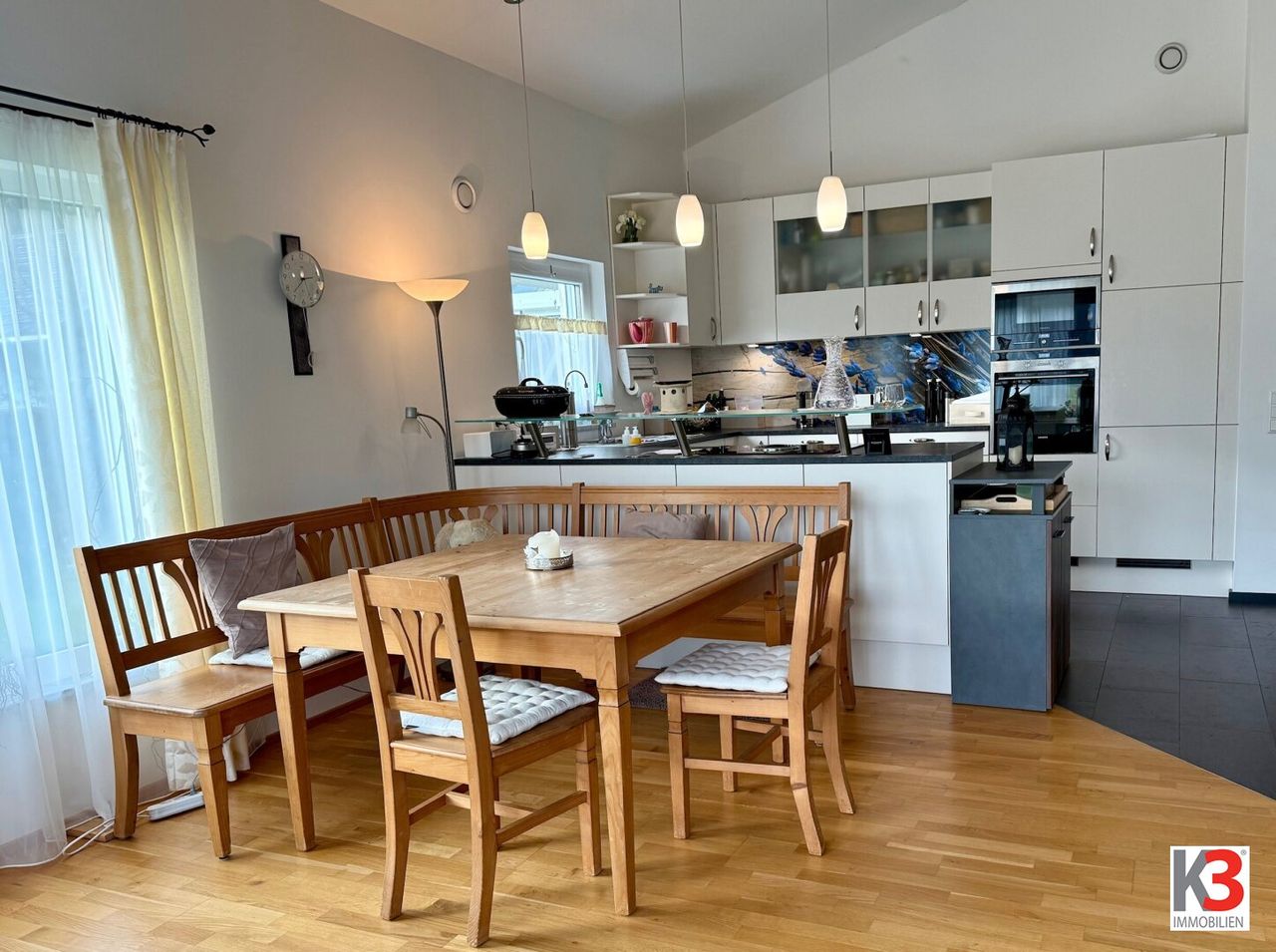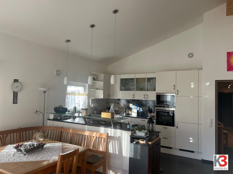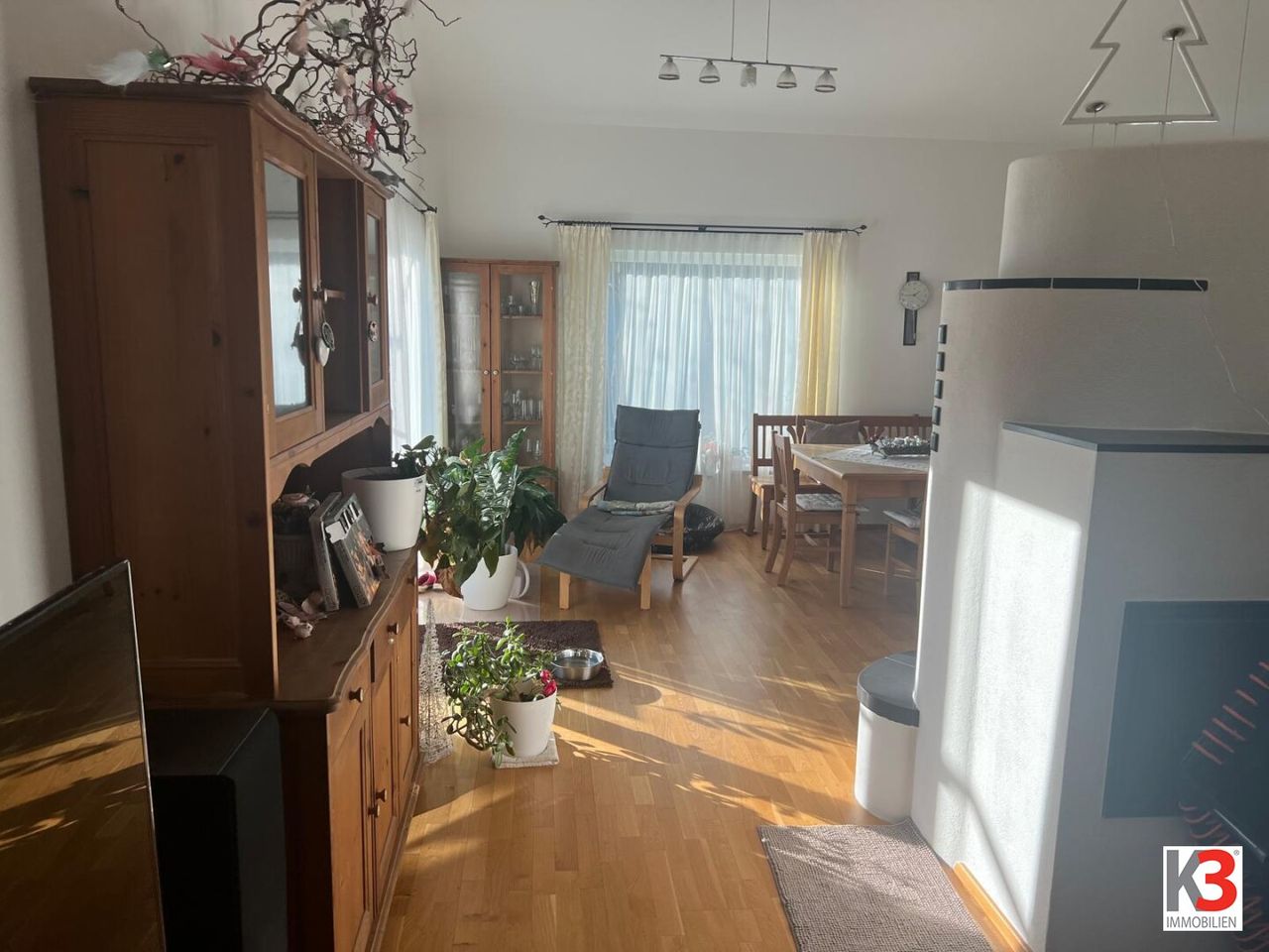 Das einmalige Flair dieses Bereiches wird durch eine tolle Raumhöhe, einen hellen, gemütlichen Essbereich und einem Kachelofen besonders hervorgehoben.