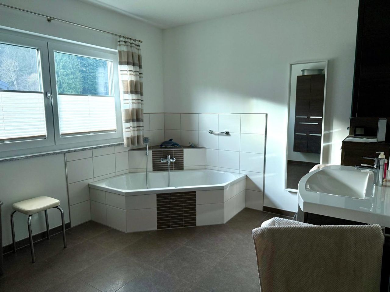 Der private Wohnbereich der Immobilie überzeugt mit drei gemütlichen Schlafzimmern, die eine ruhige Rückzugsoase bieten. Eines der Zimmer eignet sich hervorragend als Gästezimmer und verfügt über ein eigenes, modernes Bad. Das zweite Badezimmer des Hauses ist besonders geräumig und dank eines Fensters mit natürlichem Tageslicht angenehm hell. Es ist mit einer großen Eckbadewanne sowie einer separaten Dusche ausgestattet und vereint Funktionalität und Wohlfühlkomfort auf ideale Weise.