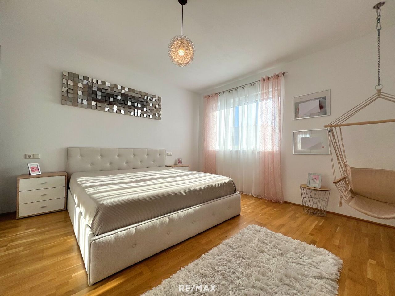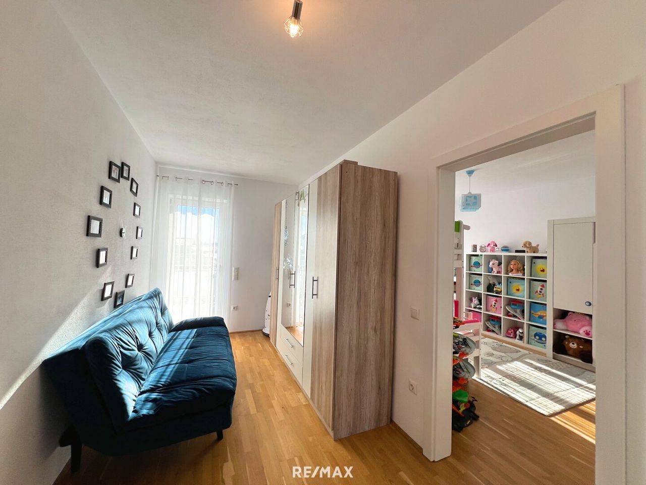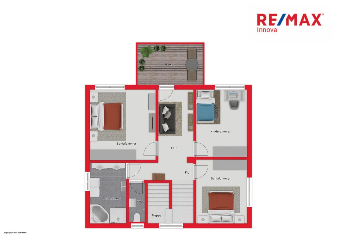 Das Obergeschoss umfasst ein großzügiges Schlafzimmer mit 18,90 m², zwei weitere Schlafzimmer bzw. Kinderzimmer mit 13,76 m² und 14,84 m², ein komfortables Badezimmer mit 10,78 m² sowie ein separates WC.