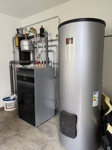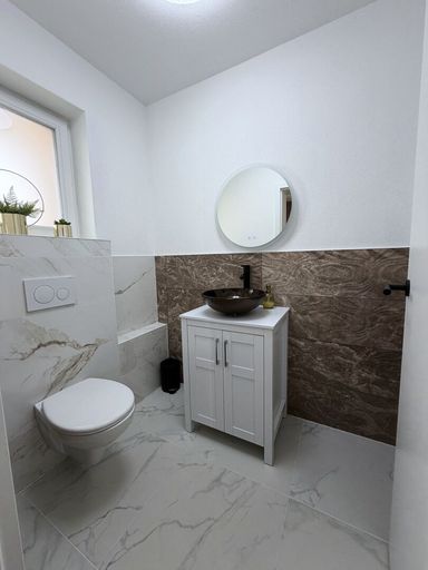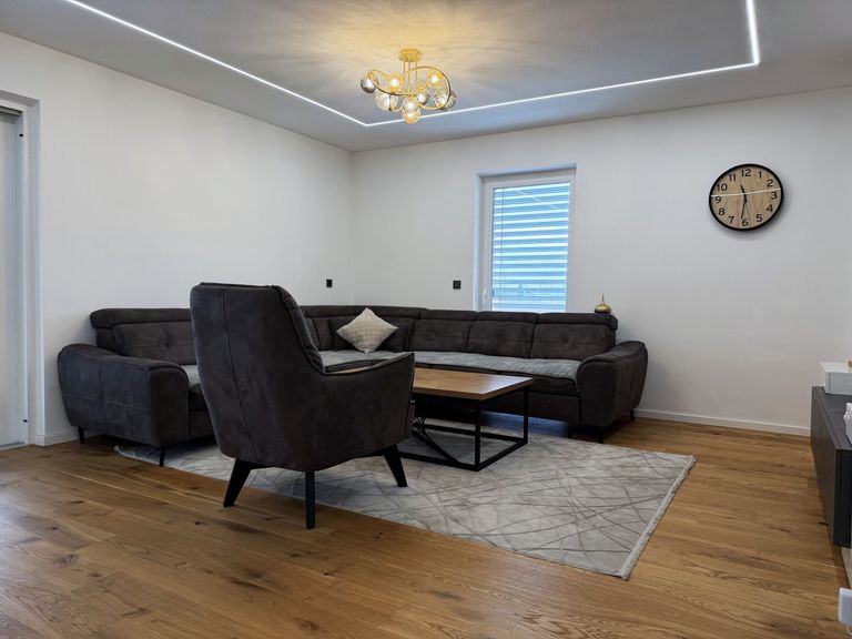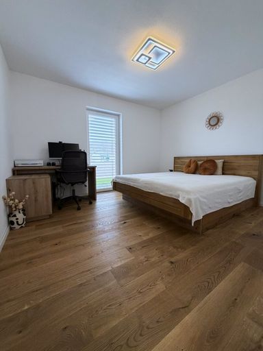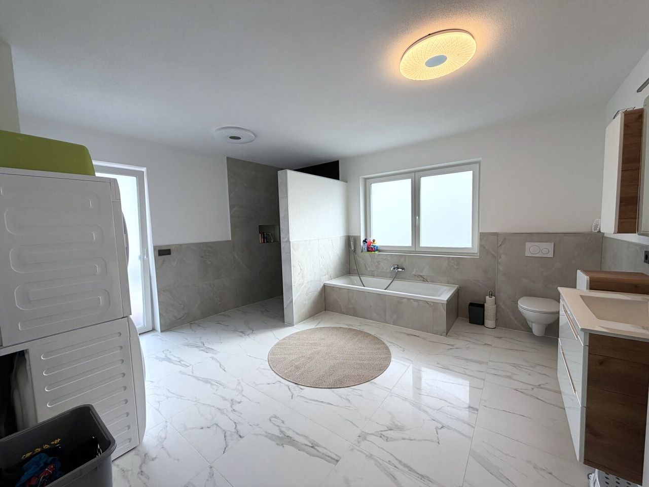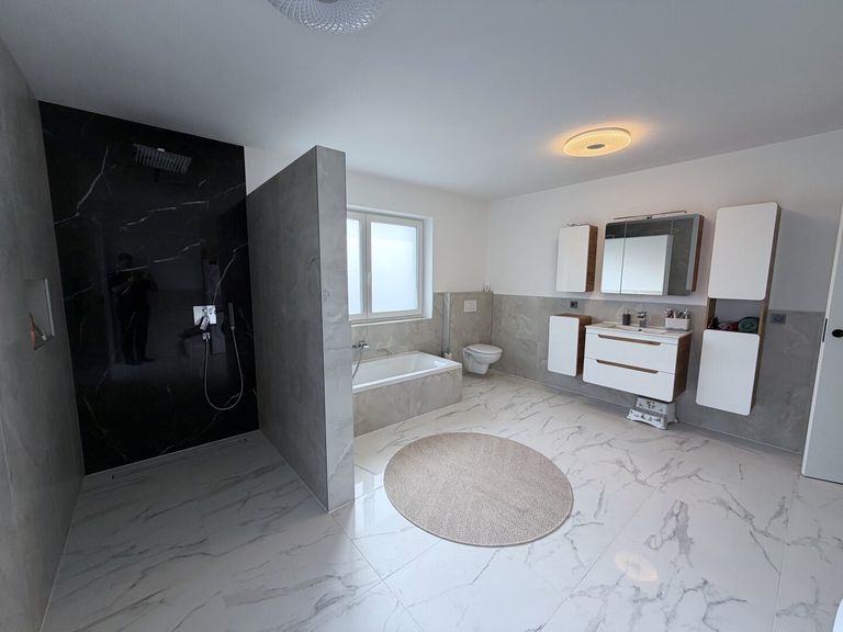 Eine Fußbodenheizung sorgt für angenehme Wärme, während die Luftwärmepumpe effiziente und umweltfreundliche Energie liefert. Das Badezimmer ist ein echter Wohlfühlort – mit Fenster, Badewanne und Dusche, ideal zum Entspannen nach einem langen Tag.