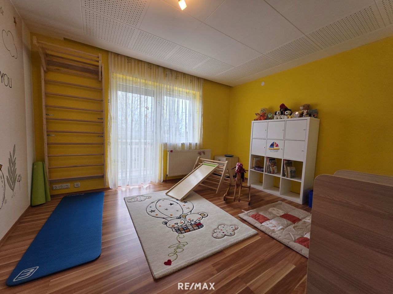 Im Obergeschoss erwarten Sie zwei helle Kinderzimmer mit Balkonzugang, ein Schlafzimmer sowie ein großzügiges Badezimmer mit Badewanne und Dusche. Ein weitläufiger Flur sorgt für ein offenes Raumgefühl und zusätzliche Nutzungsmöglichkeiten.