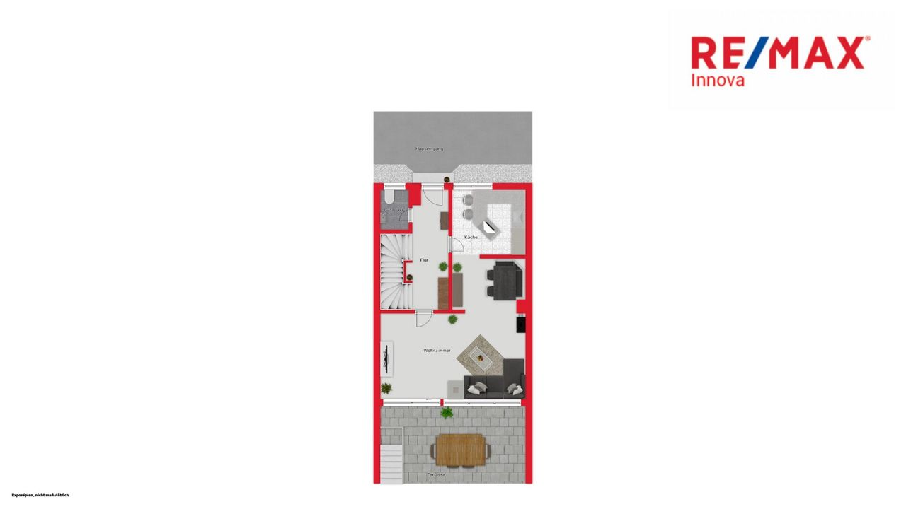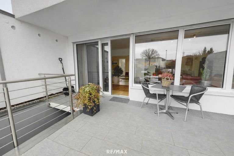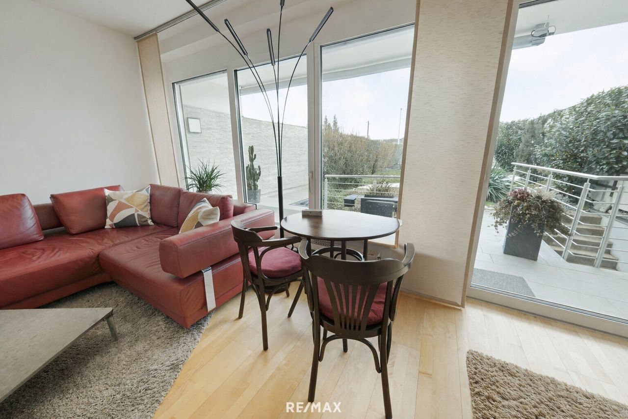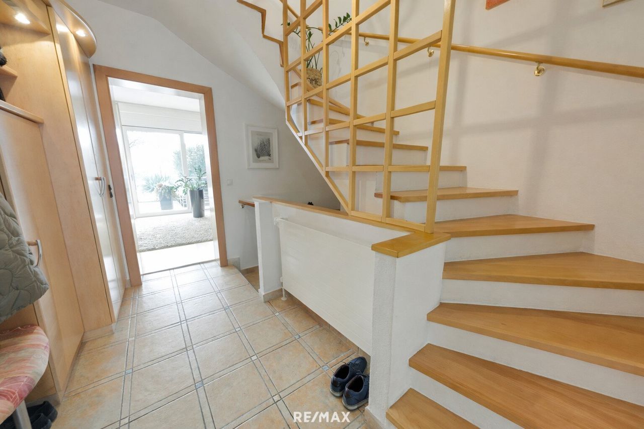 Es besteht im Erdgeschoß aus einem sehr großen Wohn-Essbereich, der Küche, Gäste WC, Vorraum und einer sonnigen Terrasse mit Zugang zum Garten und Garage.