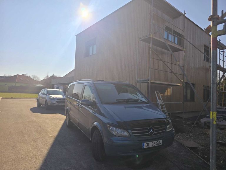 . Fassade außen Echtholz Fichte Natur mit Metall-Elementen in Schwarz