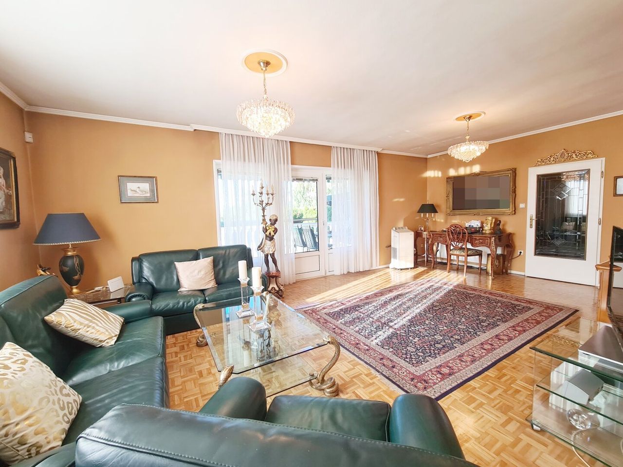 Wohnzimmer; 31m² Parkettboden, Zugang zur Terrasse 20m² mit elektr. Markise Fernblick.