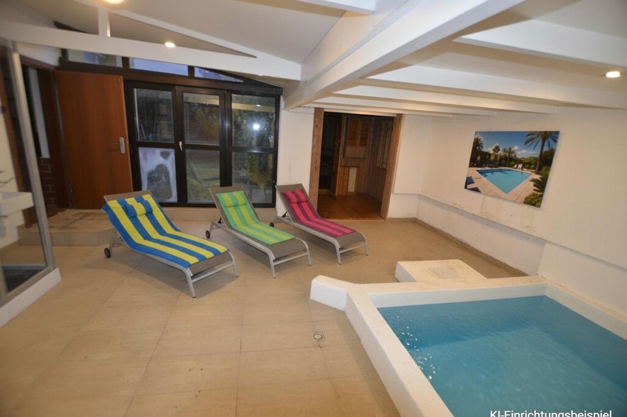 Eine Treppe führt in das Obergeschoß, wobei sich auf halber Höhe ein echtes Highlight des Hauses befindet: die großzügige Schwimmhalle mit einem neun Meter langen polyestertem Becken, einem Ruheraum sowie einer Sauna – ein privater Wellnessbereich, der ganzjährig genutzt werden kann.