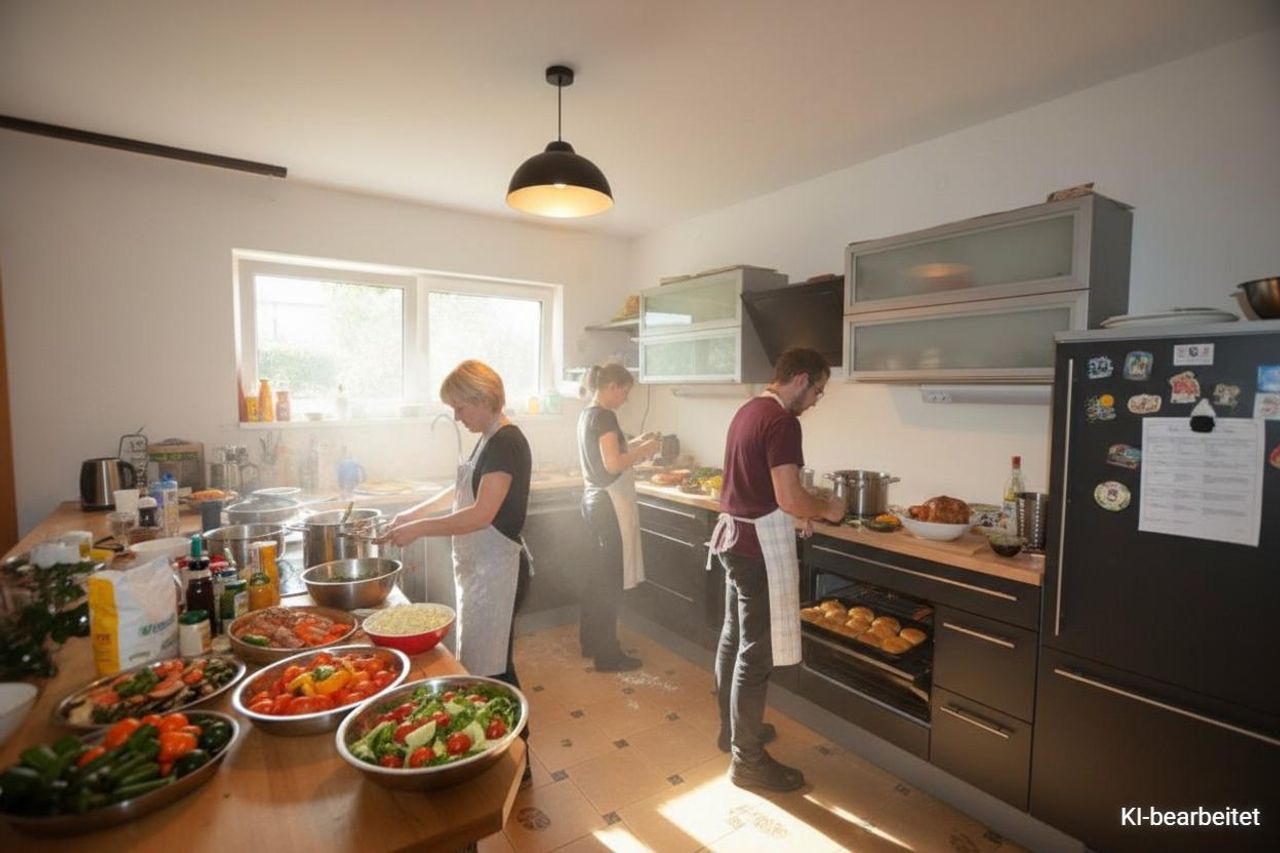 Bereits beim Betreten des Hauses empfängt uns ein großzügiger, rund 30 m² großer Vorraum, der durch seine Dimensionen auch als repräsentativer Essbereich genutzt werden könnte. Von hier aus erschließen sich die zentralen Wohnbereiche: das etwa 50 m² große Wohnzimmer mit seinen großflächigen Fenstern, dem Stein-Kaminofen und der herrlichen Südwest-Ausrichtung. Das Wohnzimmer ist ein echtes gute Laune- und Partyzimmer, geeignet auch zum Feiern und zum Tanzen. Die geräumige Küche ist mit zahlreichen Geräten ausgestattet, viel Platz was jede Köchen freuen wird.