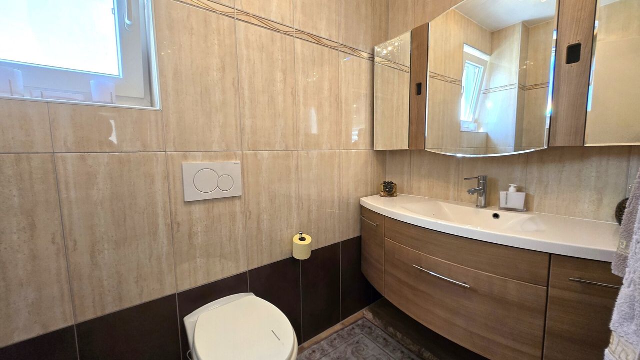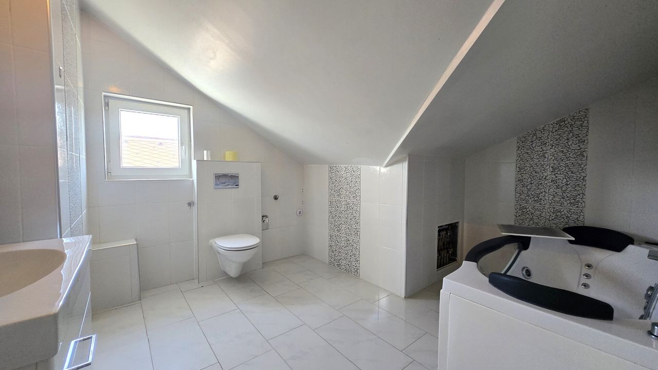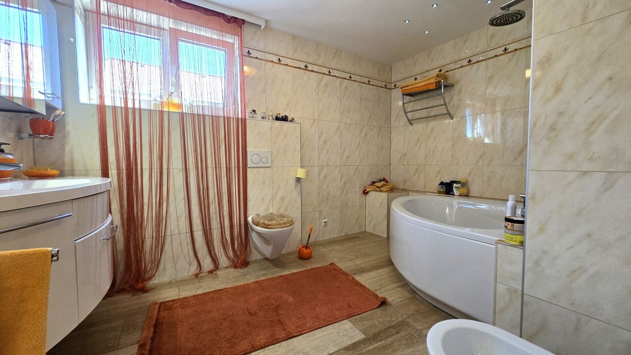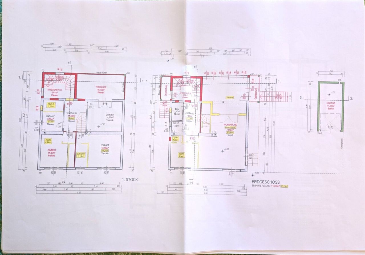 - OG mit rund 90,90 m²: Vorraum, 3 Schlafzimmer (eines davon inkl. Schrankraum), Badezimmer ausgestattet mit Wanne, WC und Bidet