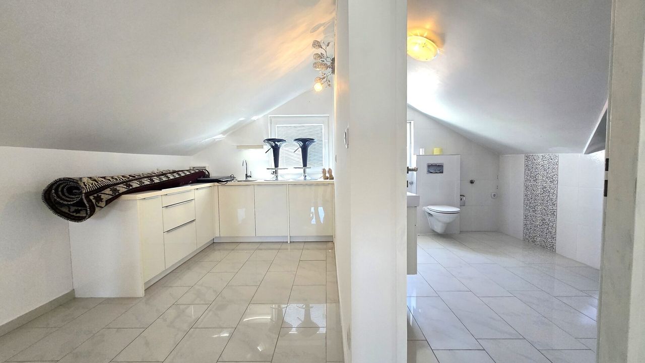 Das Dachgeschoß ist hell und besteht aus 2 Zimmern mit einer Wohnküche und einem Badezimmer mit Wanne und WC.