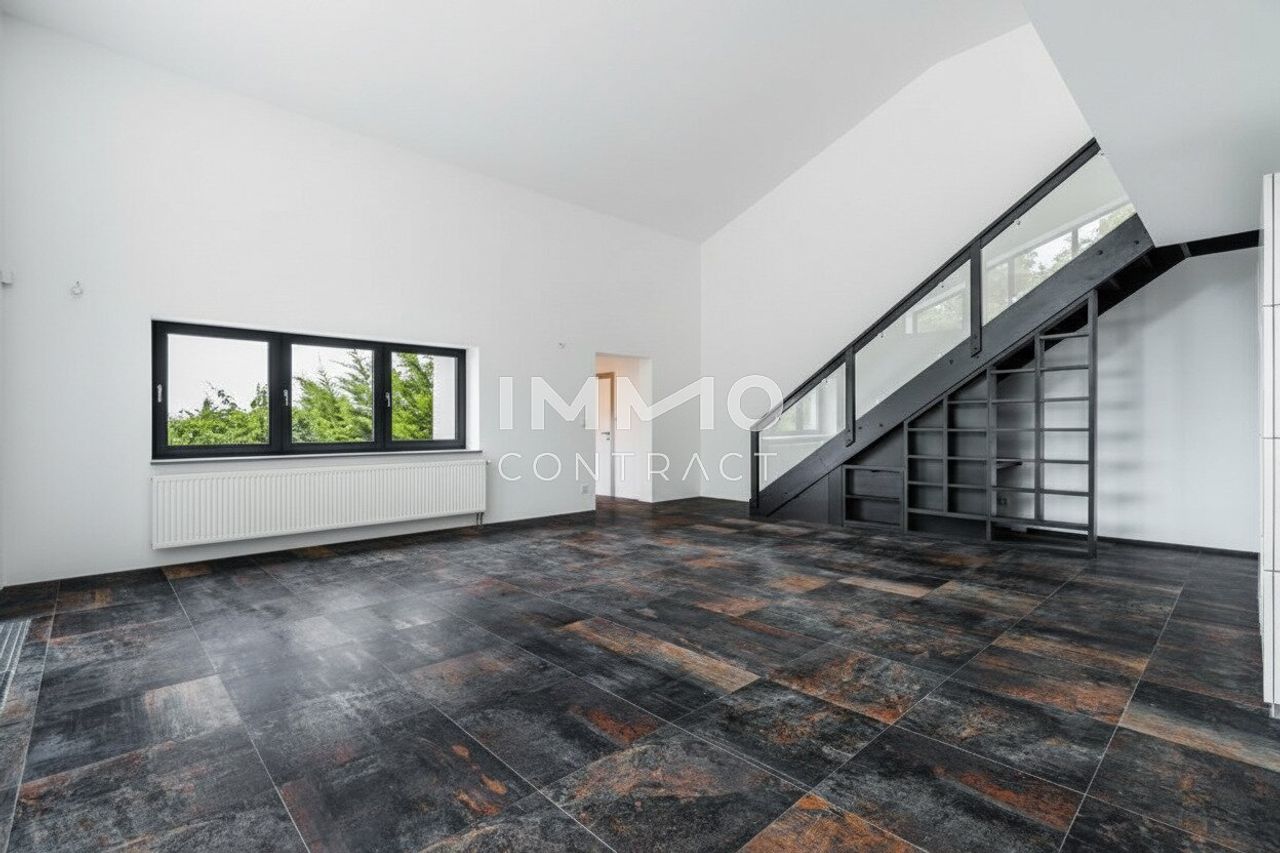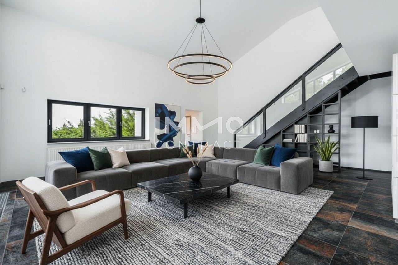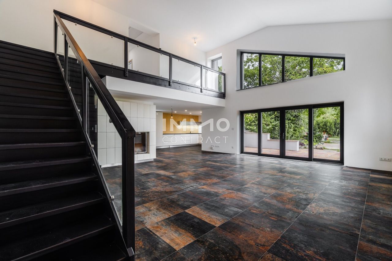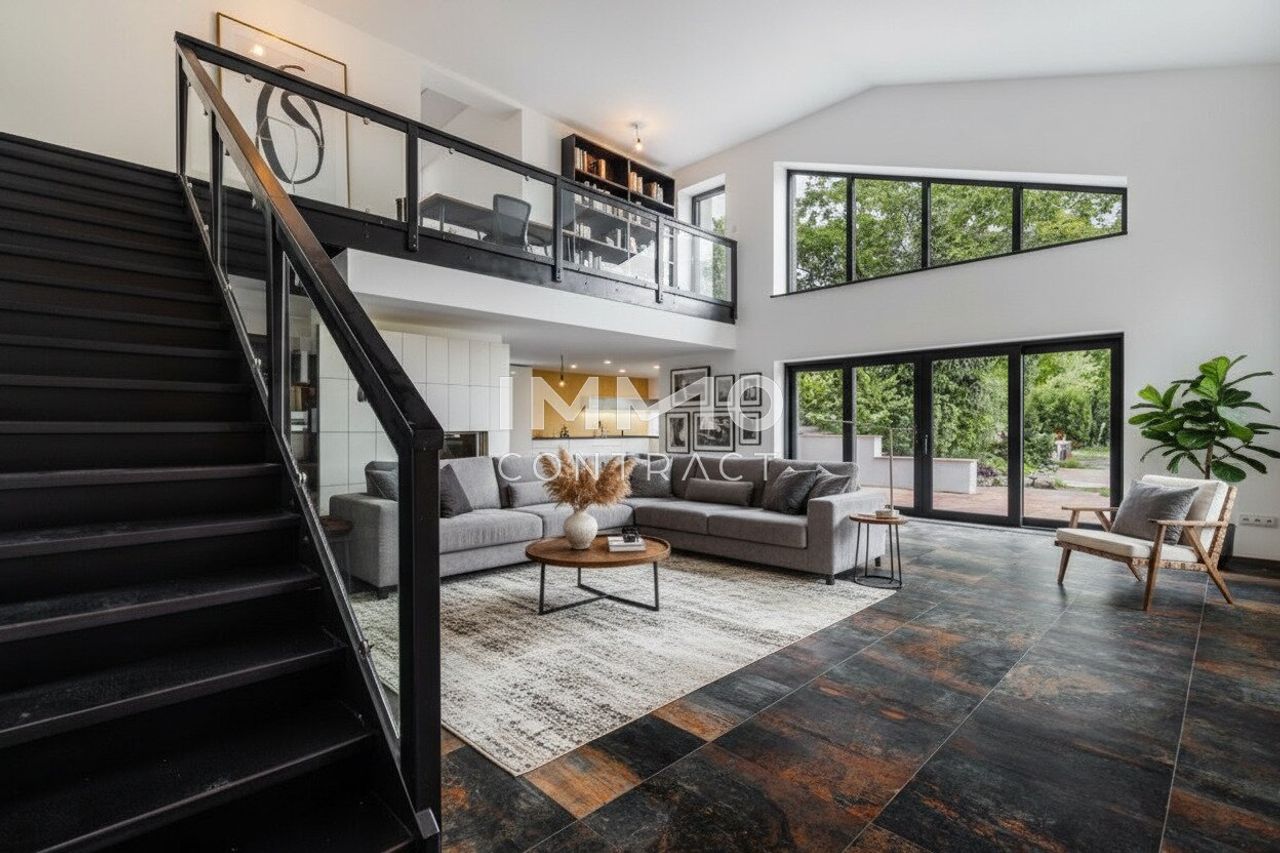 Auf rund 214 m² Wohnfläche entfaltet sich ein architektonisch prägnantes Wohnhaus mit großzügiger Raumwirkung und klarer Linienführung. Der offen gestaltete Wohn-Ess-Bereich mit überwiegend zweigeschossiger Raumhöhe (ca. 5m), Galerieebene und großflächigen Verglasungen bildet das repräsentative Zentrum des Hauses. Fließende Übergänge zu den Terrassenflächen erweitern den Wohnraum nach außen. Lichtführung, Blickachsen und Raumvolumen erzeugen ein außergewöhnlich freies und zugleich hochwertiges Wohngefühl.