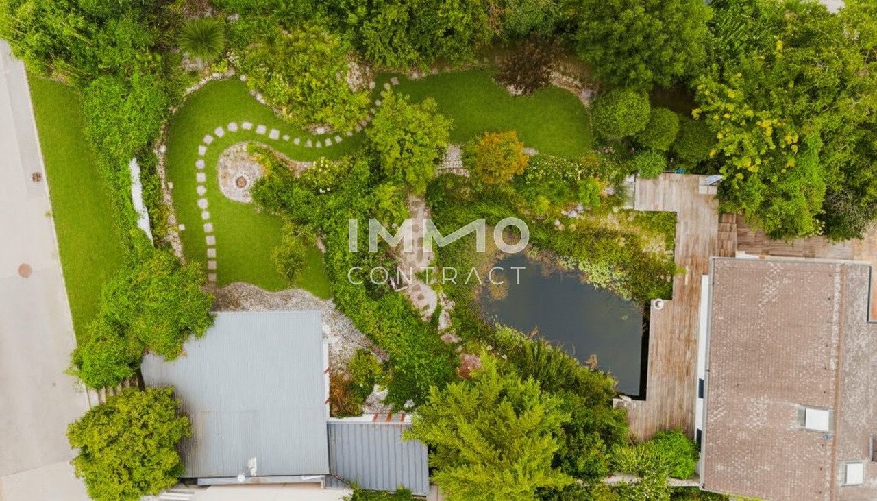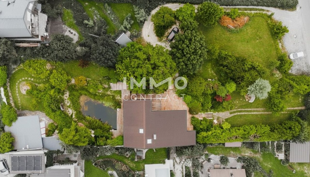 Ein besonderes Qualitätsmerkmal ist das Außenensemble: Mehrere Terrassenebenen mit insgesamt rund 155 m² Fläche, hochwertige Natursteinbereiche und sorgfältig platzierte Aufenthaltszonen schaffen differenzierte Freiräume über den gesamten Tagesverlauf. Der großzügige Schwimmteich mit Holzdeck und Wasserfallanlage bildet das visuelle und funktionale Zentrum des Gartens. Ergänzt wird die Anlage durch Bachlauf, Feuerstelle, Natursteinwege sowie gewachsenen Baum- und Strauchbestand — eine Gartenkomposition mit hoher gestalterischer und atmosphärischer Qualität. Abgerundet werden die Außenflächen mit Anschlüssen für Whirlpool und Sauna.