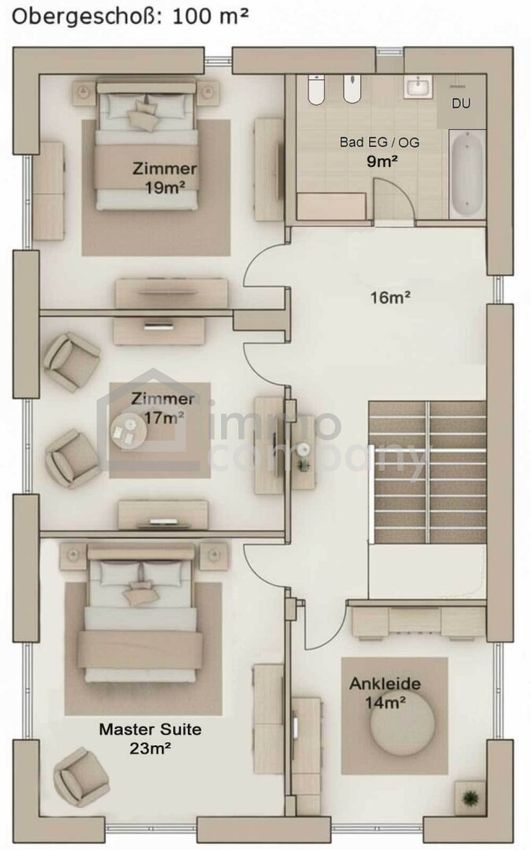 - OG: 3-4 Schlafzimmer, begehbares Ankleidezimmer, Bad mit Dusche und Wanne