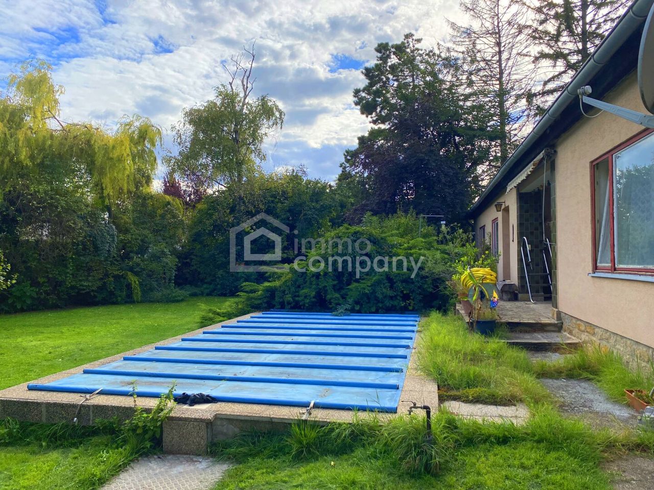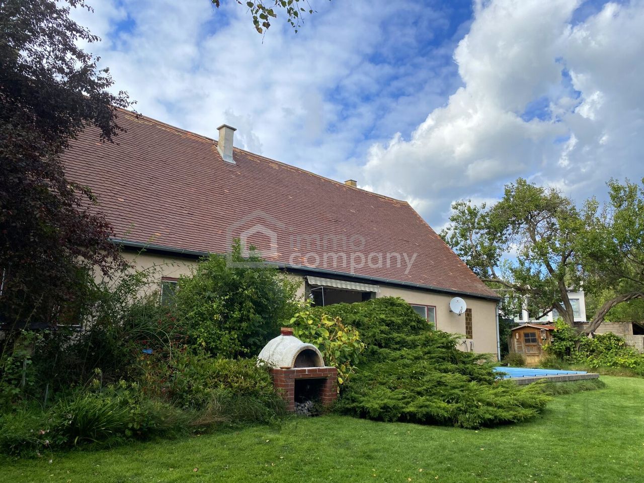 Dieses romantische Einfamilienhaus wurde aus einem alten Bauernhaus entwickelt und befindet sich freistehend in einem uneinsehbaren Garten. Eine als absolute Ruhelage zu bezeichnende Position am Rand einer Wohnsiedlung ohne Durchzugsverkehr gewährleistet ein Wohnerlebnis der besonderen Art. Im Erdgeschoß befinden sich 5 Zimmer, die mit etwas Zuwendung zu einer vielfältig nutzbaren Dimension entwickelt werden können. Im Obergeschoß befinden sich zwei Schlafzimmer und ein noch nicht ausgebauter Dachboden in beeindruckender Dimension. Auf der Gartenseite befindet sich eine uneinsehbare Terrasse die den freien Blick auf den eigenen, ausschließlich von weiteren Gärten umschlossenen Garten eröffnet. Vor der Terrasse befindet sich uneinsehbar ein großzügiges Swimmingpool. Ein Altbaumbestand bietet Schatten vor der Fassade. Das Grundstück ist über eine gesonderte Zufahrtsstraße zu erschließen und befindet sich derzeit in Teilung.