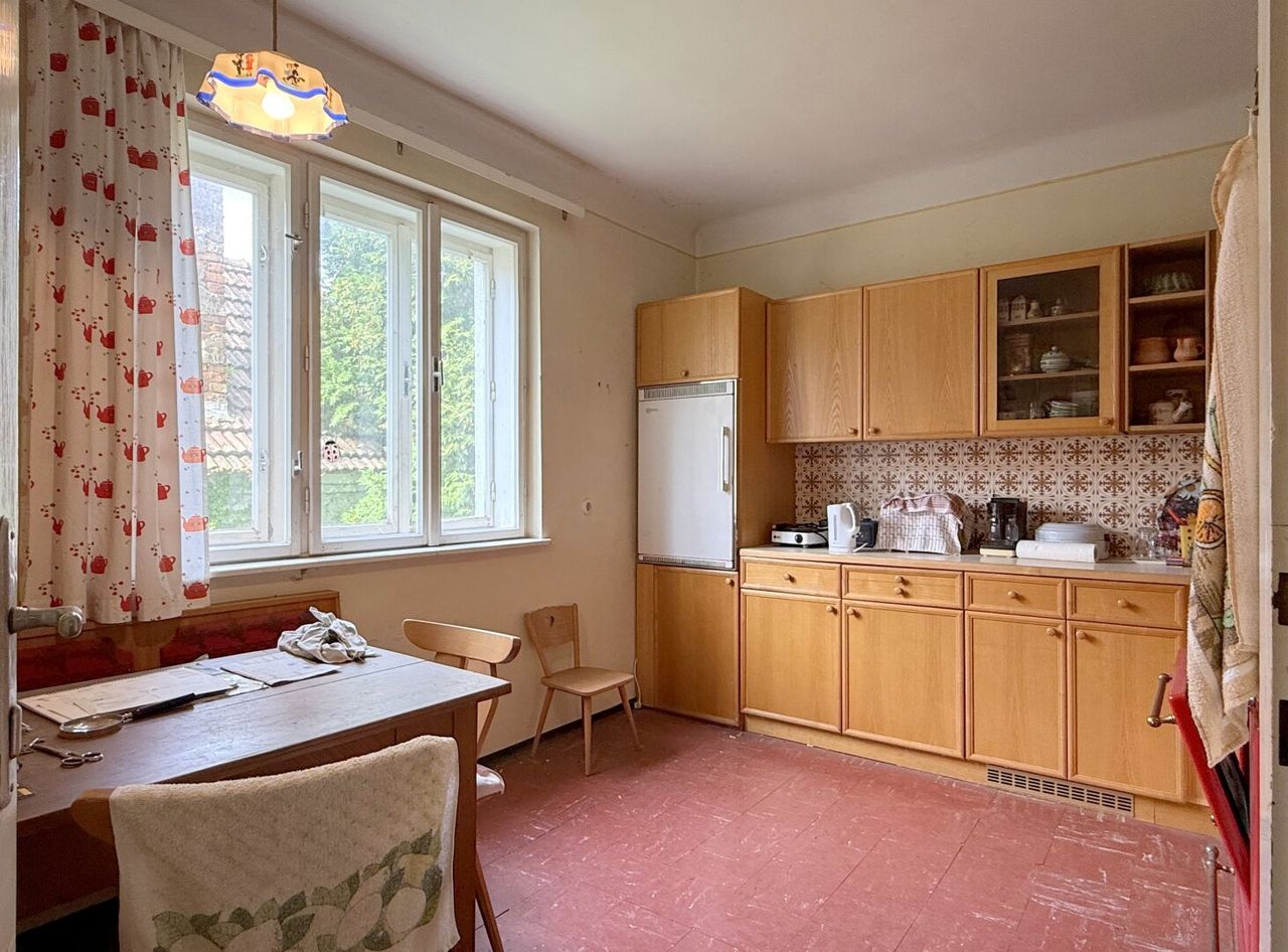 Grundsätzlich hat es aber einen sehr guten Schnitt. Im erhöhten Erdgeschoss befinden sich zwei Zimmer, eine gemütliche Küche, ein kleines Bad, Windfang und Vorraum – schlicht, aber wohnlich. Im Obergeschoss warten drei weitere Zimmer, eines davon mit Zugang auf den langen Balkon, der auf den Garten hinausführt. Darunter liegt der Keller mit viel Stauraum und typischem Werkstattcharakter.