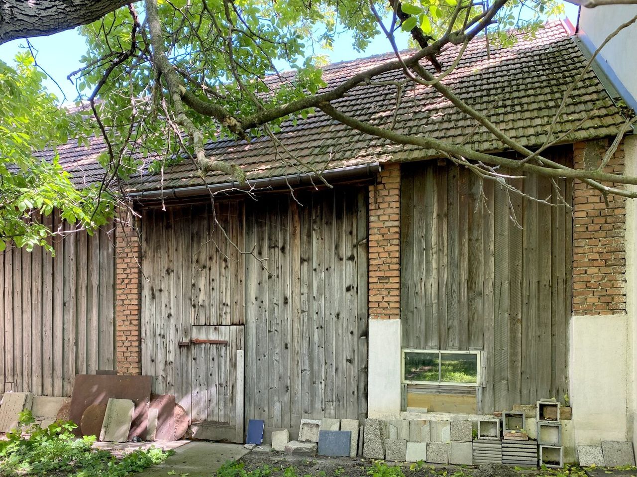 Das alte Nebengebäude – praktisch, aber auch schon etwas in die Jahre gekommen – wartet nur darauf, wieder genutzt zu werden. Es steht mitten auf dem langgestreckten, ruhigen Grundstück, umgeben von altem Baumbestand und viel Platz. Eine große Scheune schließt sich an – wunderbar für alles, was Raum braucht: Ideen, Geräte oder einfach Dinge, die man nicht wegwerfen kann.