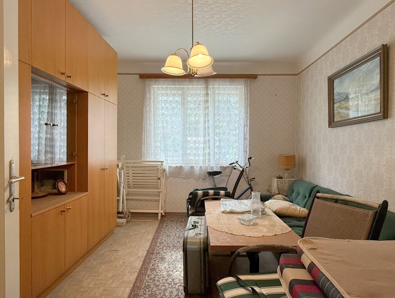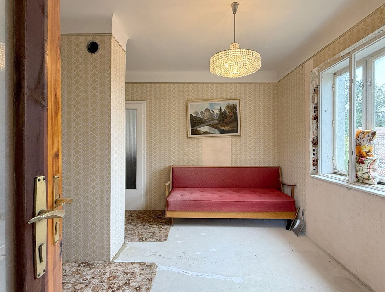 Das Wohnhaus stammt aus den 1960er-Jahren, umfasst rund 110 m² Wohnfläche auf zwei Ebenen und ist zusätzlich voll unterkellert (ca. 55 m²). Es ist in die Jahre gekommen, keine Frage – vieles gehört erneuert, manches ersetzt, und wahrscheinlich alles aufgefrischt. Aber zwischen den vielen alten unterschiedlichen Blümchentapeten, den schweren Türen und den kleinen Details aus einer anderen Zeit blitzt immer wieder dieser leise Charme vergangener Jahrzehnte auf.