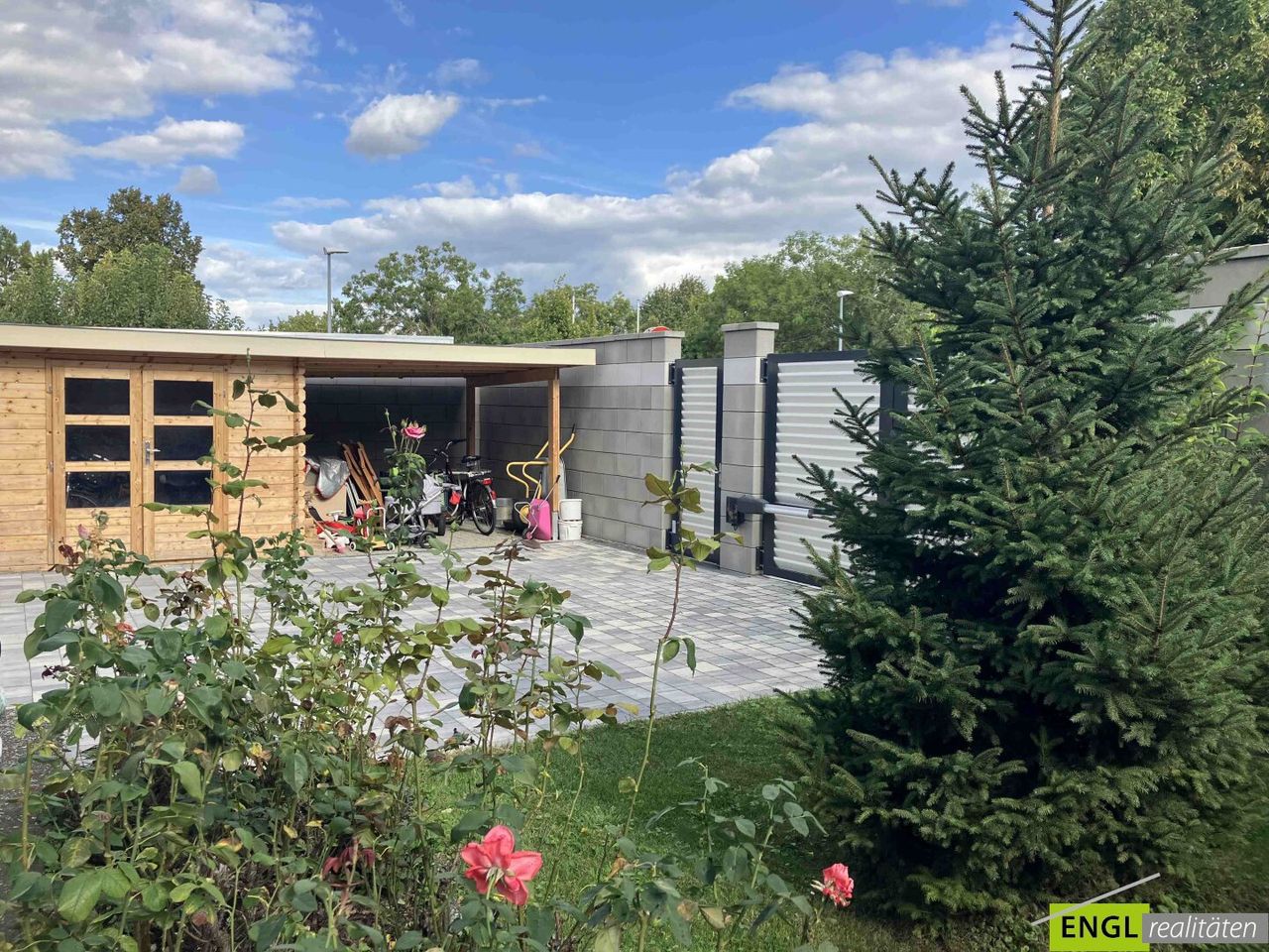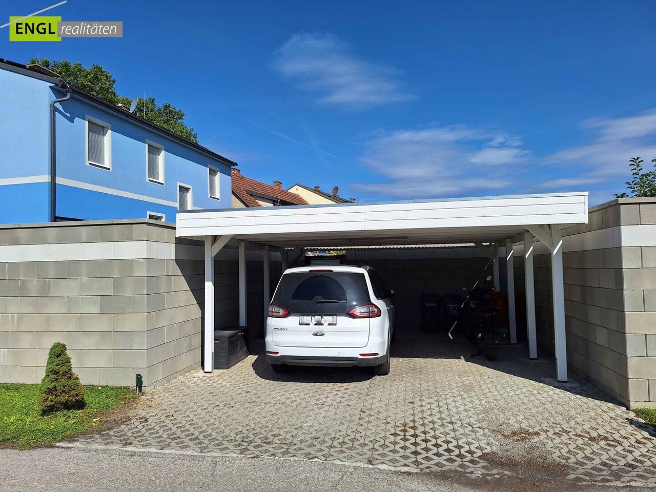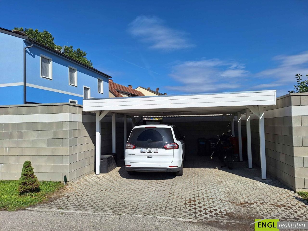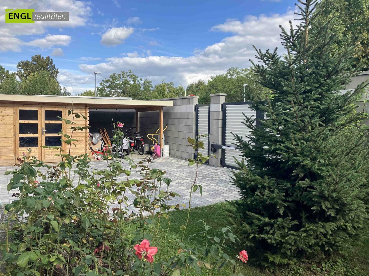 Neben dem Eingangsbereich befinden sich ein Nebengebäude sowie ein großzügiges Carport für zwei PKWs, das 2021 neu errichtet wurde. Weitere Stellplätze stehen auf dem Grundstück zur Verfügung. Die Außenanlage wurde 2022 modern gepflastert und aufwendig gestaltet.