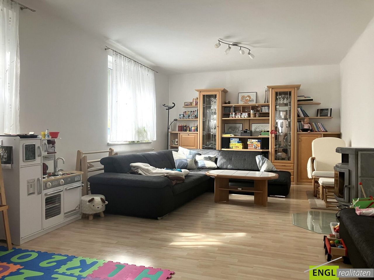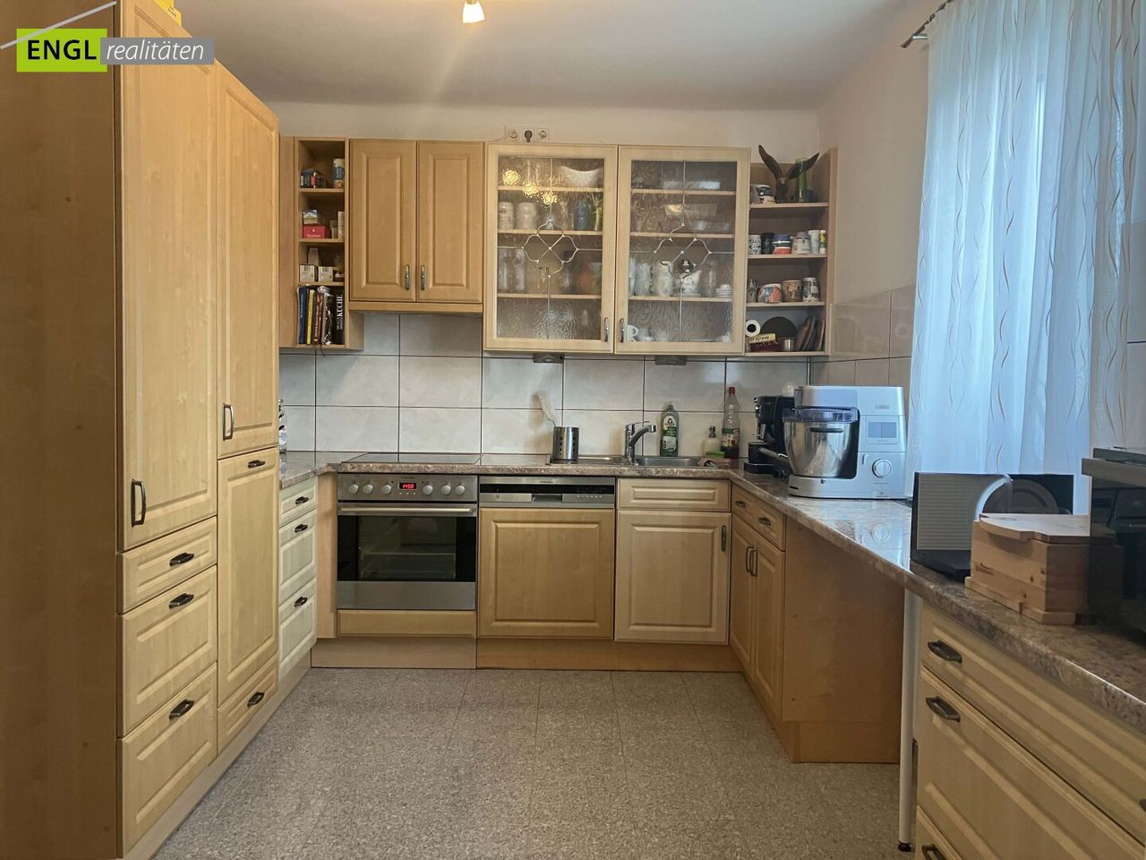 Die Ausstattung umfasst eine moderne Einbauküche, Bäder mit Wanne und Dusche sowie zeitlose Bodenbeläge aus Fliesen und Laminat, die ein behagliches Wohnambiente schaffen.