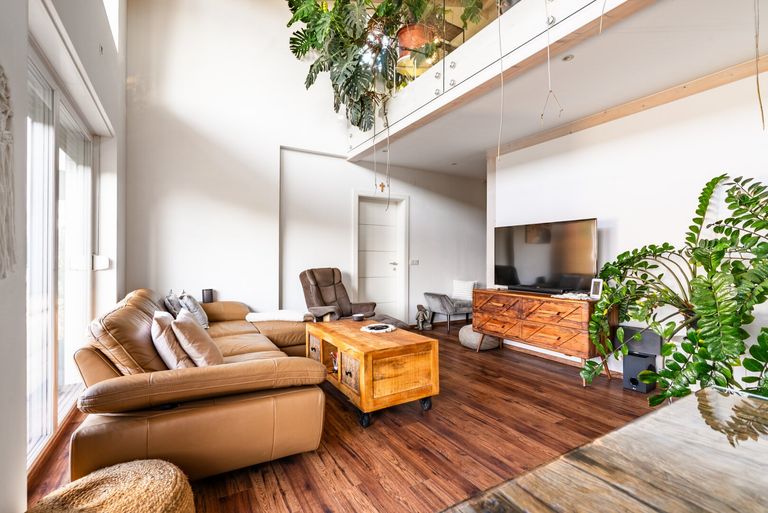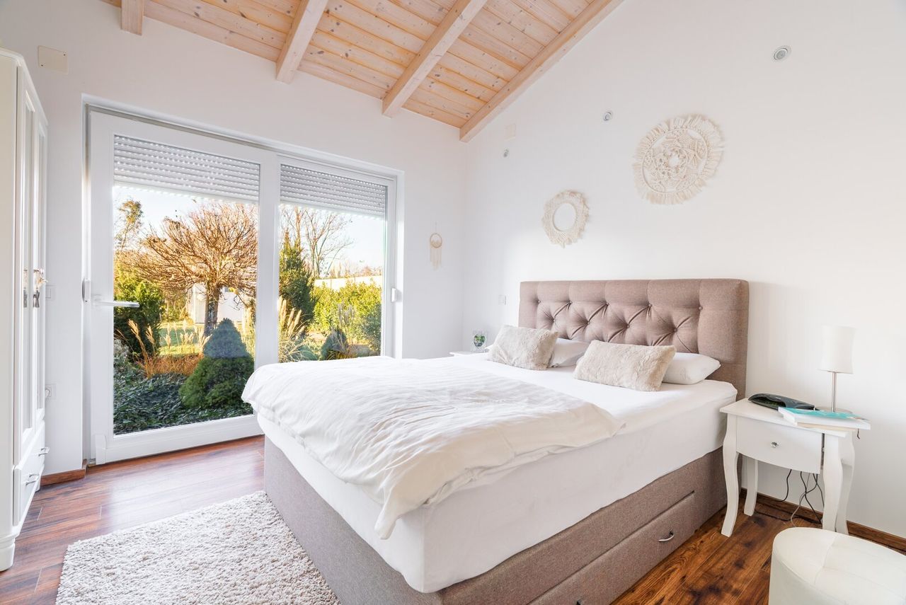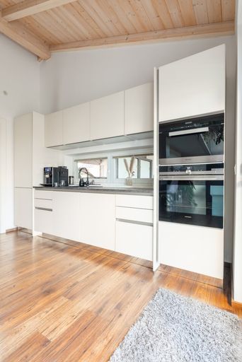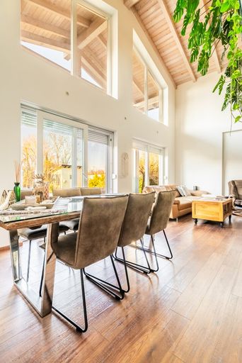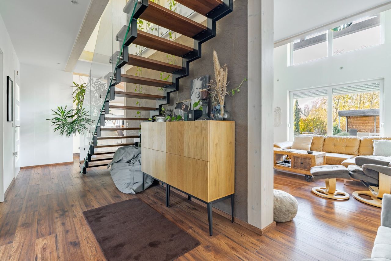 Der zentrale Wohnbereich präsentiert sich offen gestaltet, mit hohen Räumen und sichtbarem Holzdachstuhl. Durch die Galerie entsteht ein beeindruckendes Raumgefühl, das Licht und Offenheit perfekt kombiniert. Die bodentiefen Fenster sorgen für helle Räume und direkten Gartenzugang.