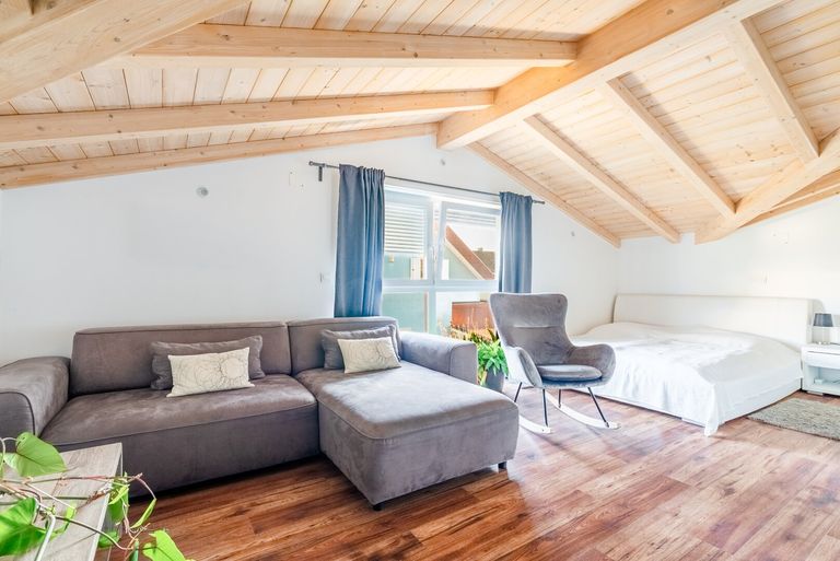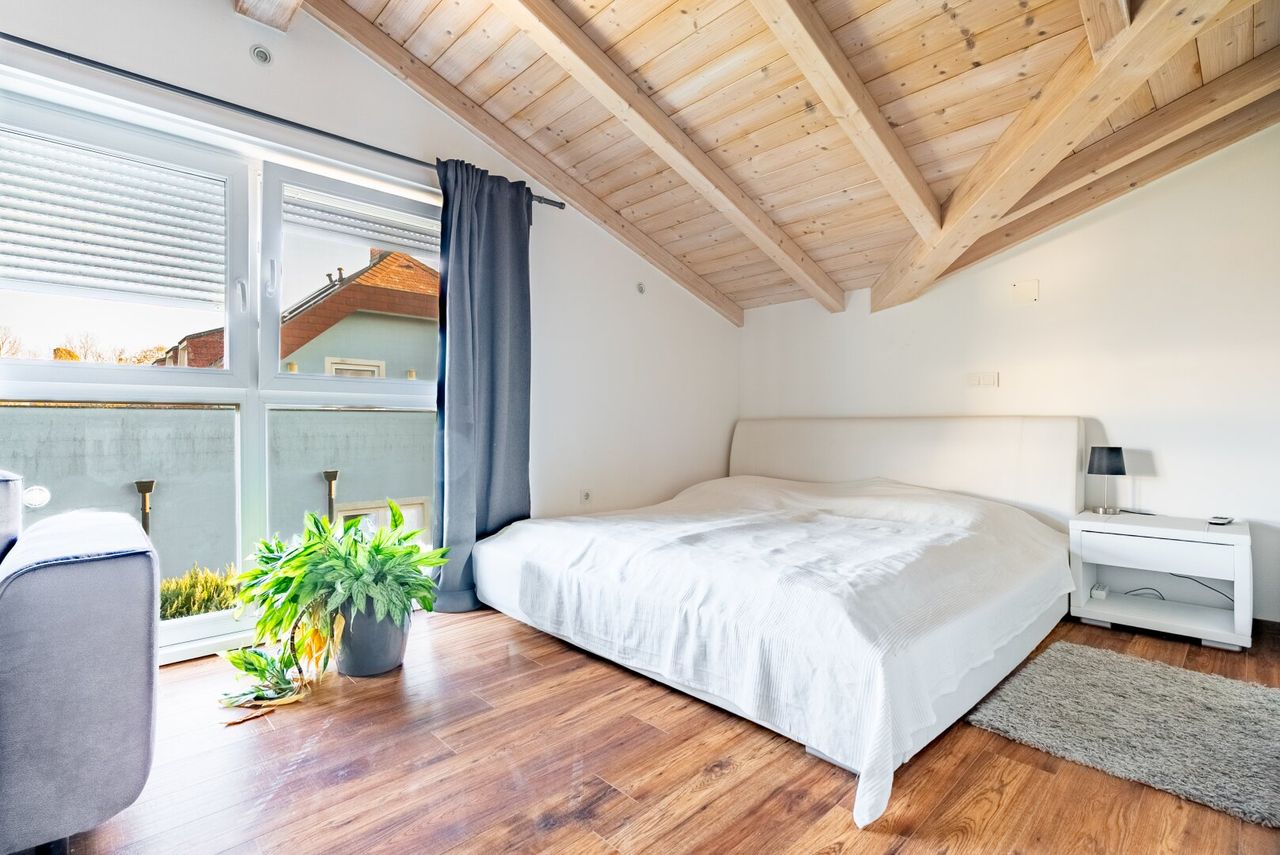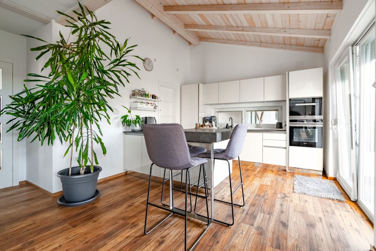 - Holzdachstuhl sichtbar, was ein warmes, natürliches Wohngefühl schafft
