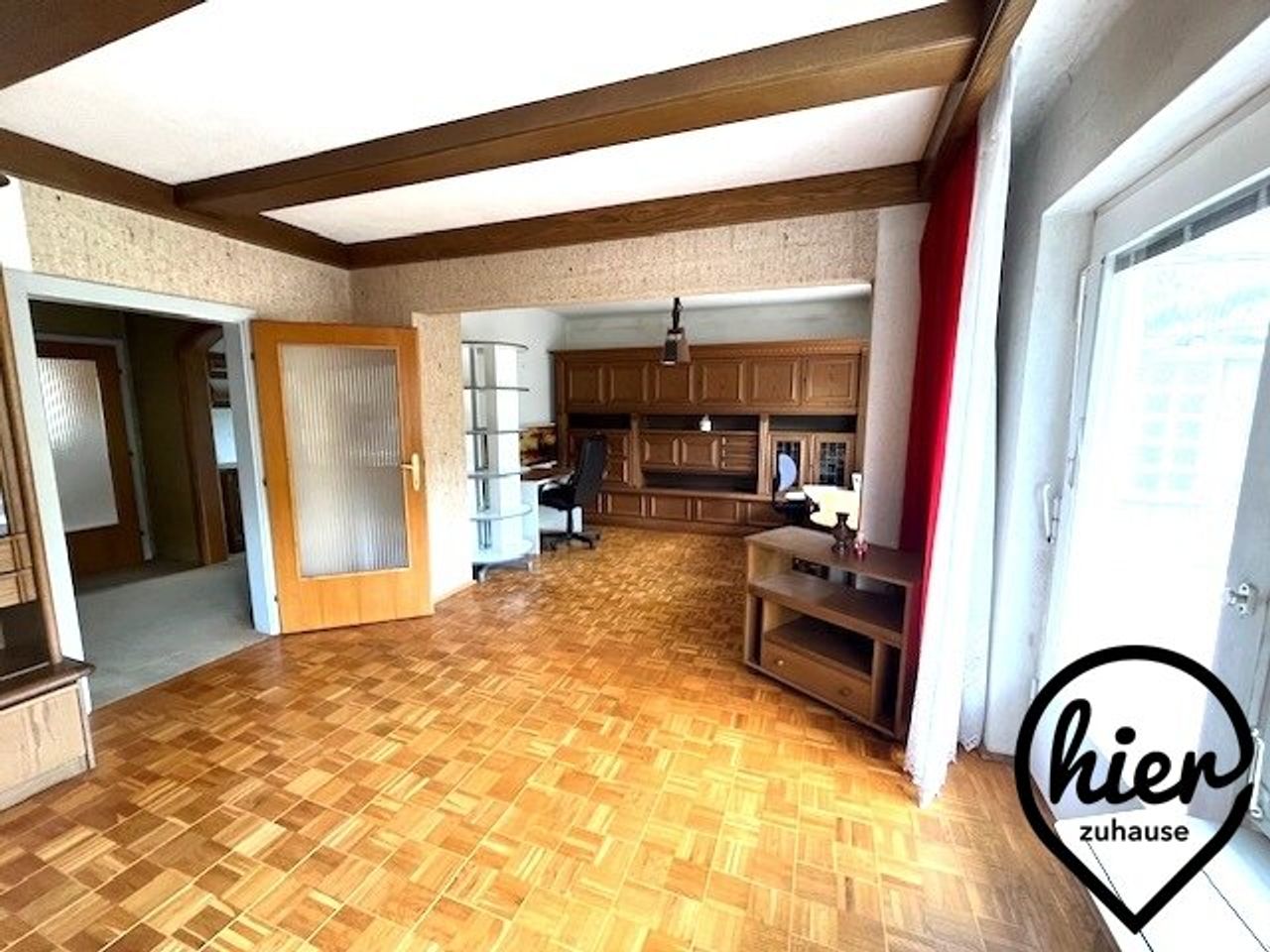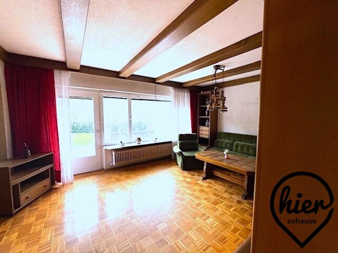 - Großzügiges Wohnzimmer (ca. 36,0 m² – könnte in 2 Räume geteilt werden) mit Zugang zur ca. 30 m² großen Süd-TERRASSE (gefliest) mit direktem Abgang in den idyllischen Garten