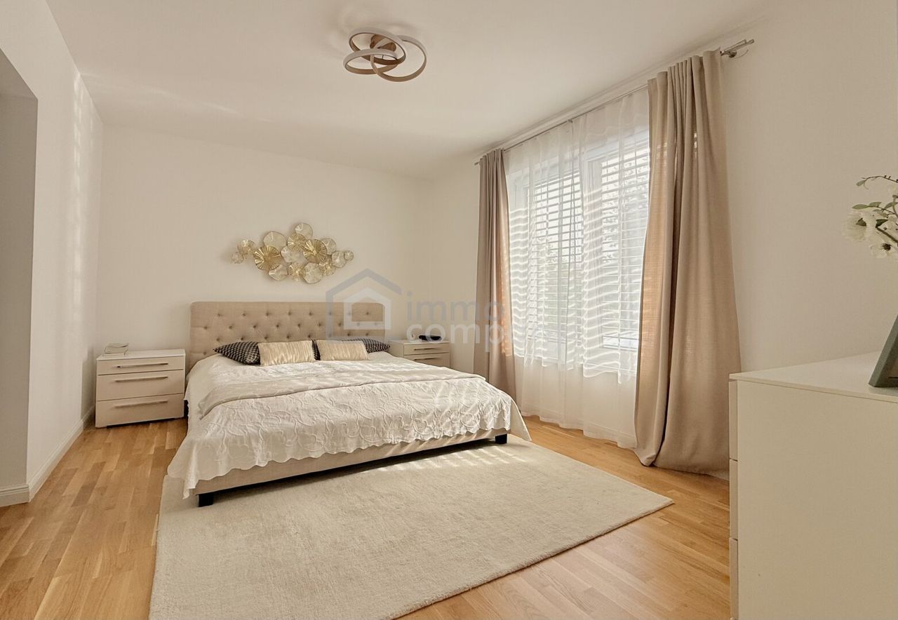 Im Obergeschoss erwarten Sie vier helle Schlafzimmer – zwei davon mit Zugang zu den Balkonen, die morgens im Osten und abends im Westen magische Lichtmomente schenken. Ein zusätzliches Büro mit Bibliothek sowie ein modernes Bad machen die Etage komplett.