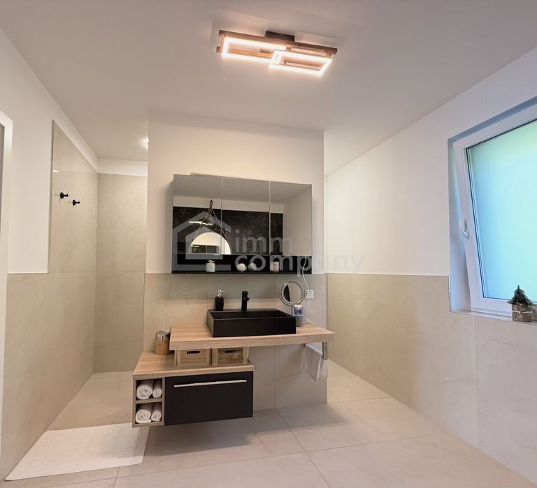 - Hochwertige Ausstattung: Edler Dreischichtparkett, exklusive Fliesen und Badausstattung, elektrische Raffstores im Erdgeschoss sowie elektrische Rollläden im Obergeschoss.