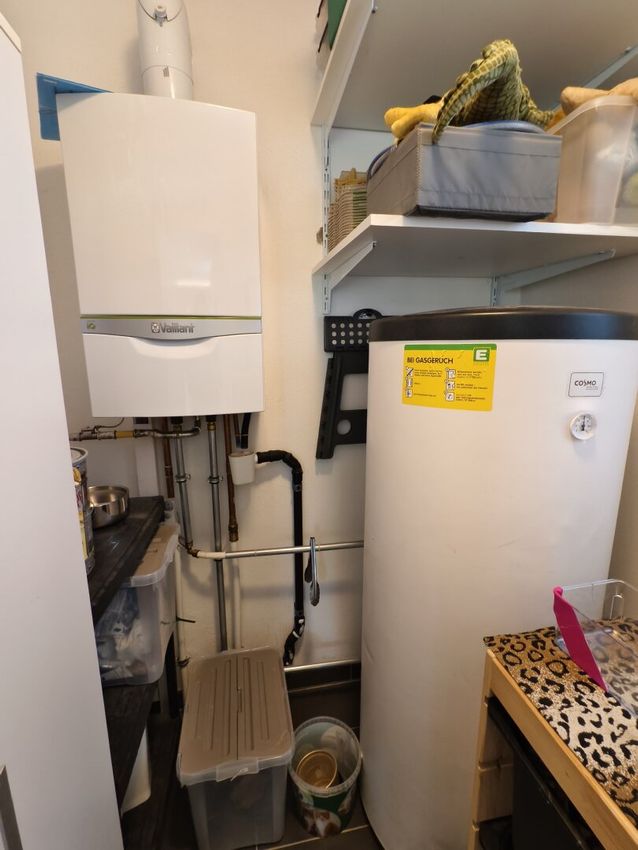 Heizung: Gas-Zentralheizung (Fußbodenheizung), Kachelofen