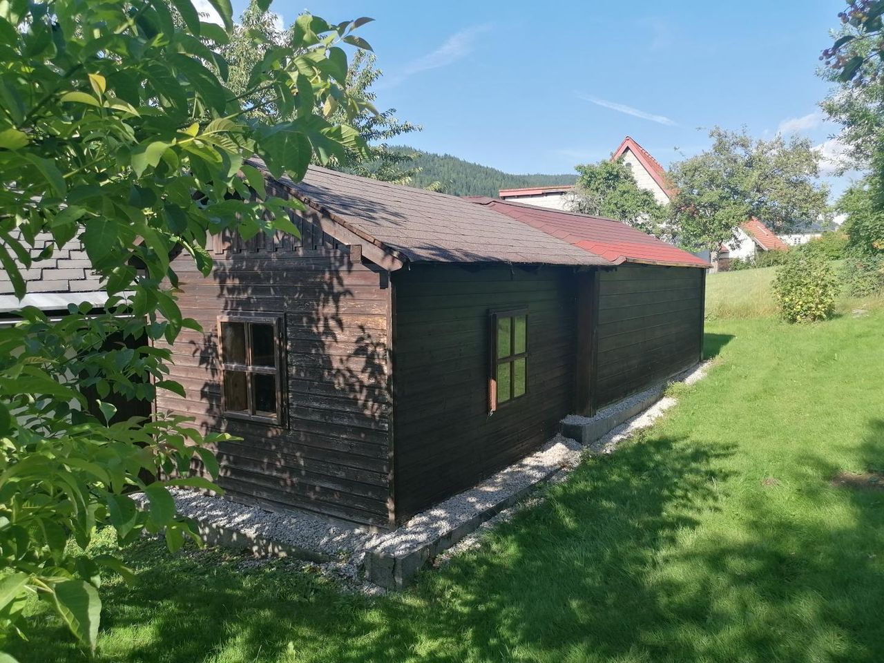 • Holzhütte mit Aufenthaltsräumen und Holzterrasse – ideal für gemütliche Stunden im Freien