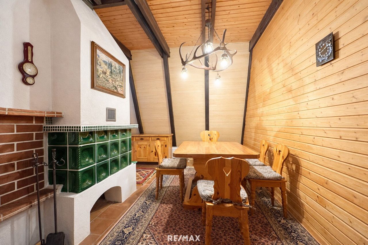 Der stilvolle Kachelofen (Baujahr 1985) sorgt nicht nur für wohlige Wärme, sondern auch für ein authentisches, alpines Ambiente.